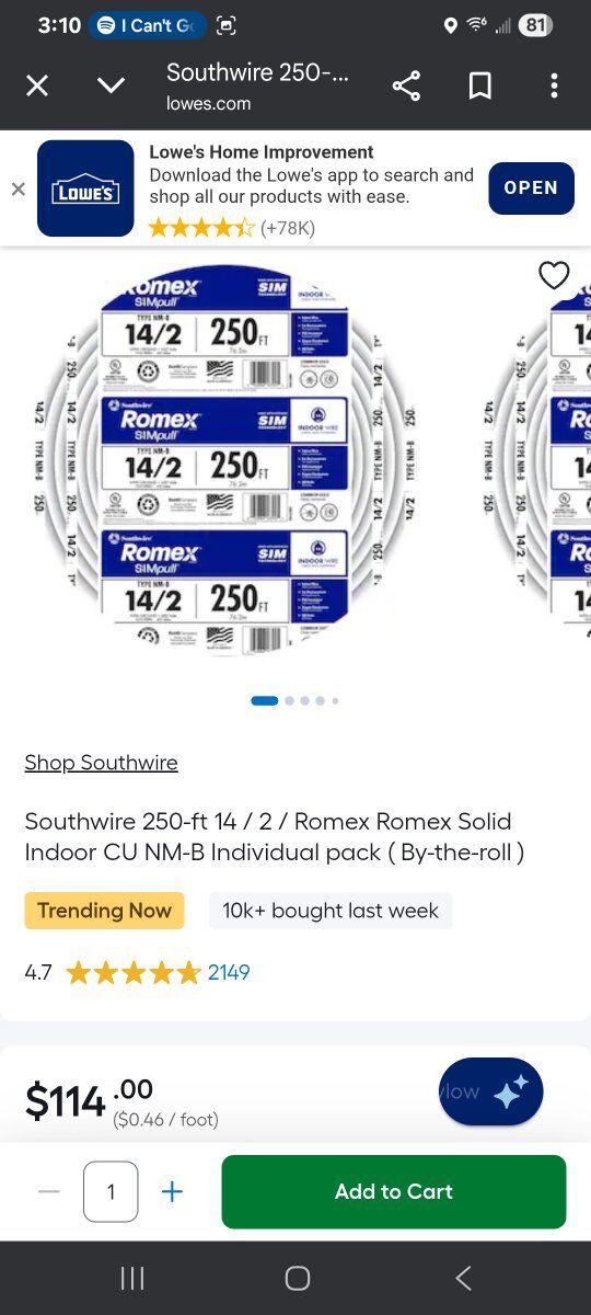 12/2: $140 a roll. $159 at Lowe's/Home Depot 14/2: $95 a roll. $114 at Lowe's/ Home Depot