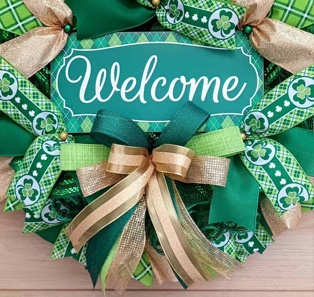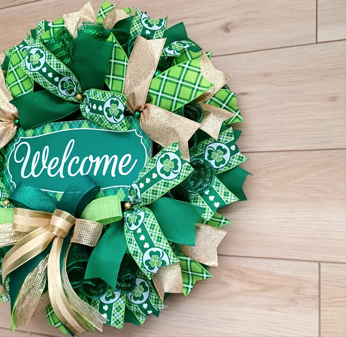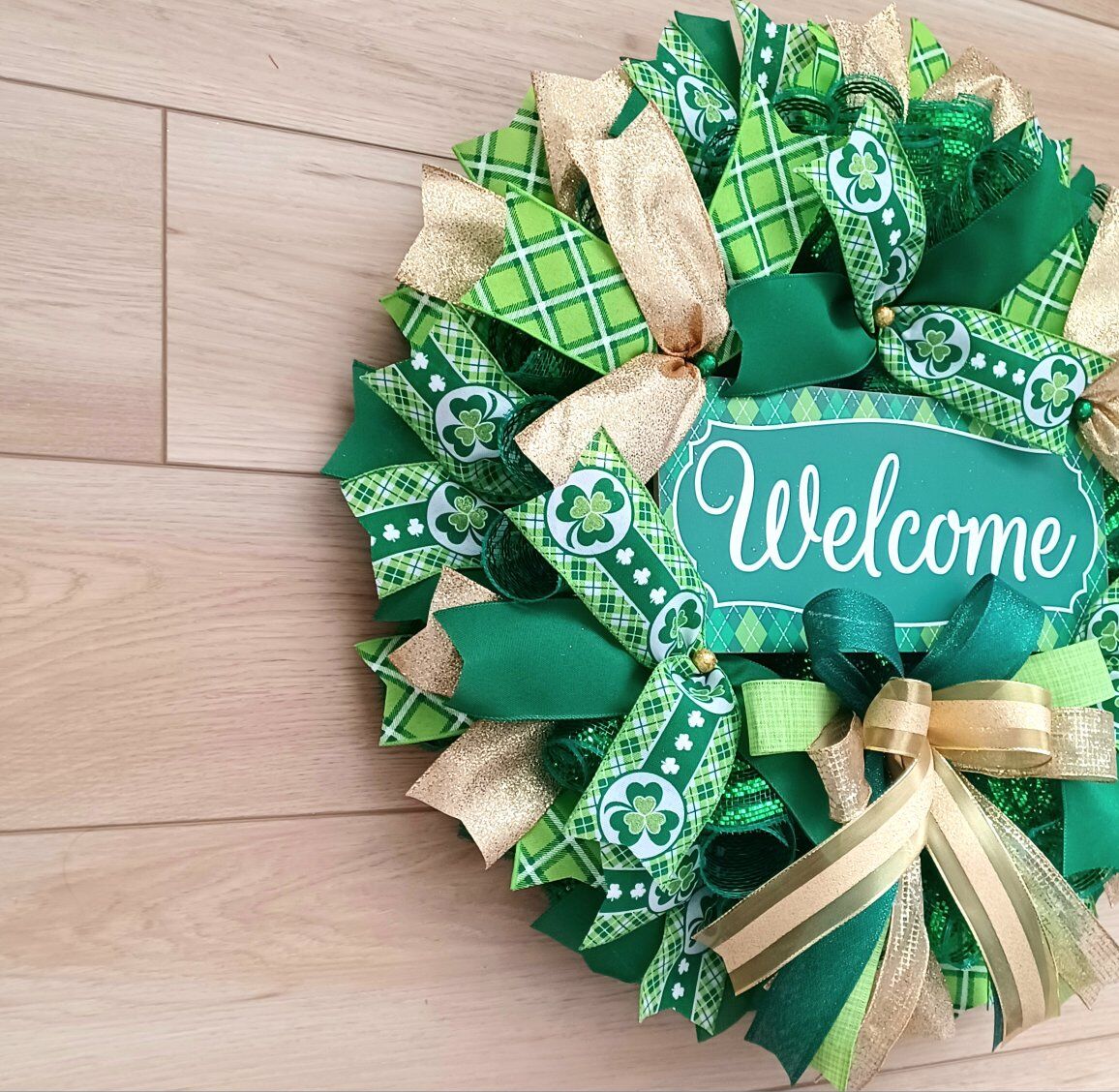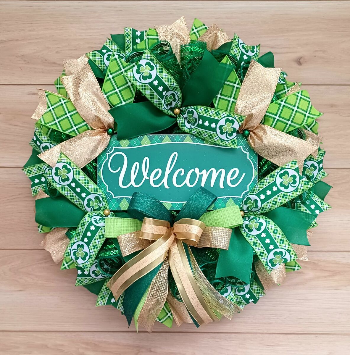 St. Patrick’s Day wreath for sale featuring a beautiful “Welcome” sign, perfect for adding festive charm to your front door or home décor. Handmade with care, 24" size, customizable, and available for shipping. Message me if you’re interested!