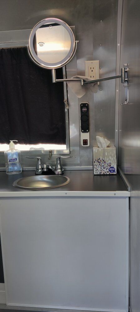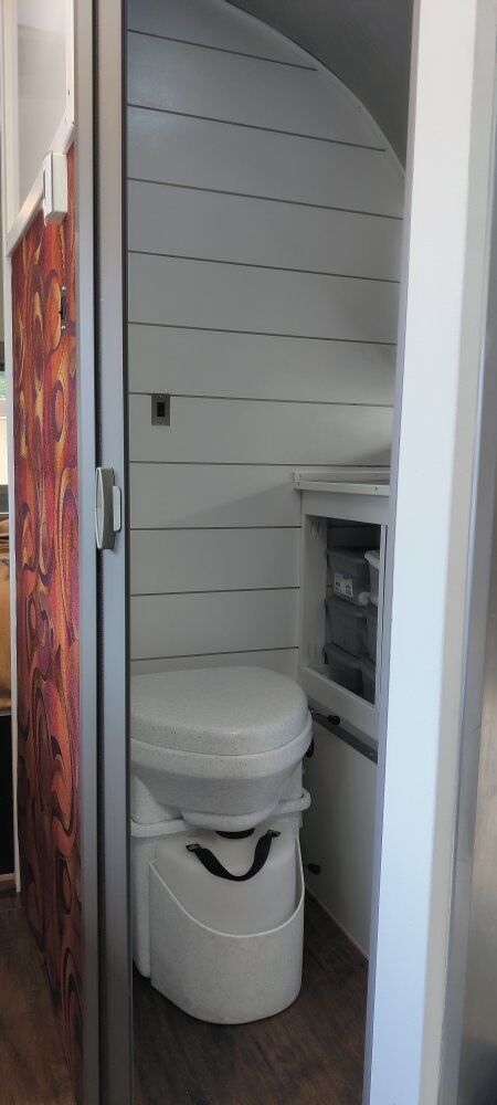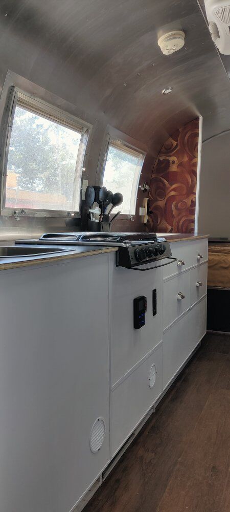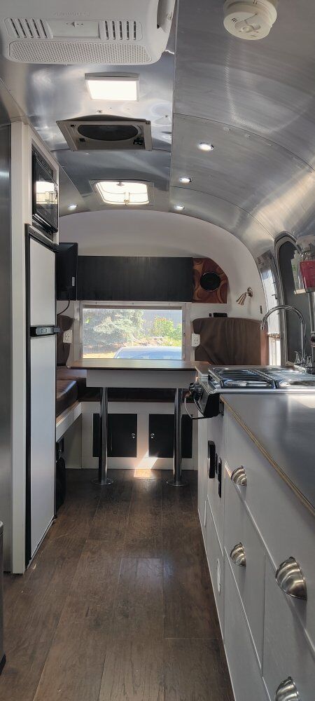 The only things original are the exterior (95% polished) and the actual trailer (which has been de-rusted and enamel coated). New axles, shocks and wheels, tires have about 1000 miles on them (tires purchased new in of 2024). All new electrical (110 and 12-volt) and includes a 200 watt solar power system. On-demand tankless water heater, full size refrigerator, stereo system with DVD/TV output (TV included), and a 35 gallon fresh water tank. Included is a separate transportable 36 gallon gray tank, and an easy to use composting toilet (no black tank to mess with).