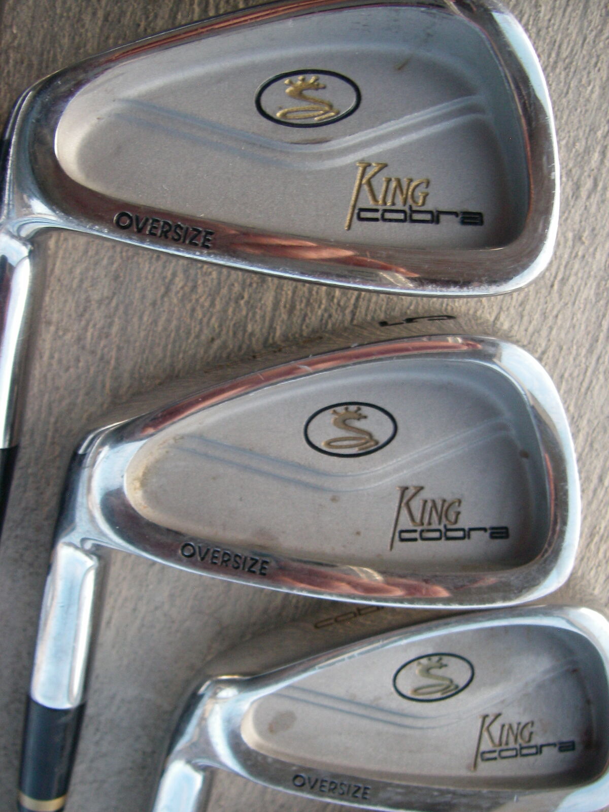 Left Hand Mens KING COBRA OVERSIZE Golf Clubs Irons Set, Steel Shafts, Firm Flex, Std Length. 3-9 irons (have some optional Callaway and TaylorMade wedges). Bag not included.