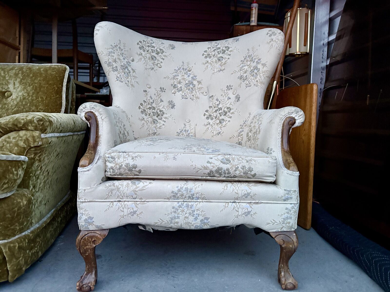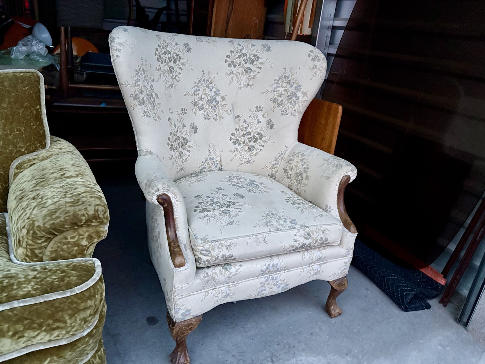 VenmoStunning vintage Queen Anne style wingback armchair, featuring with a a beautiful floral pattern fabric and cabriole legs.