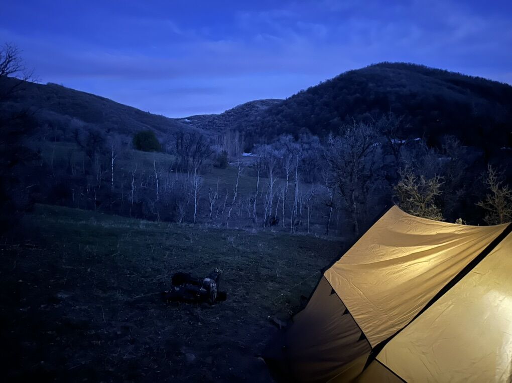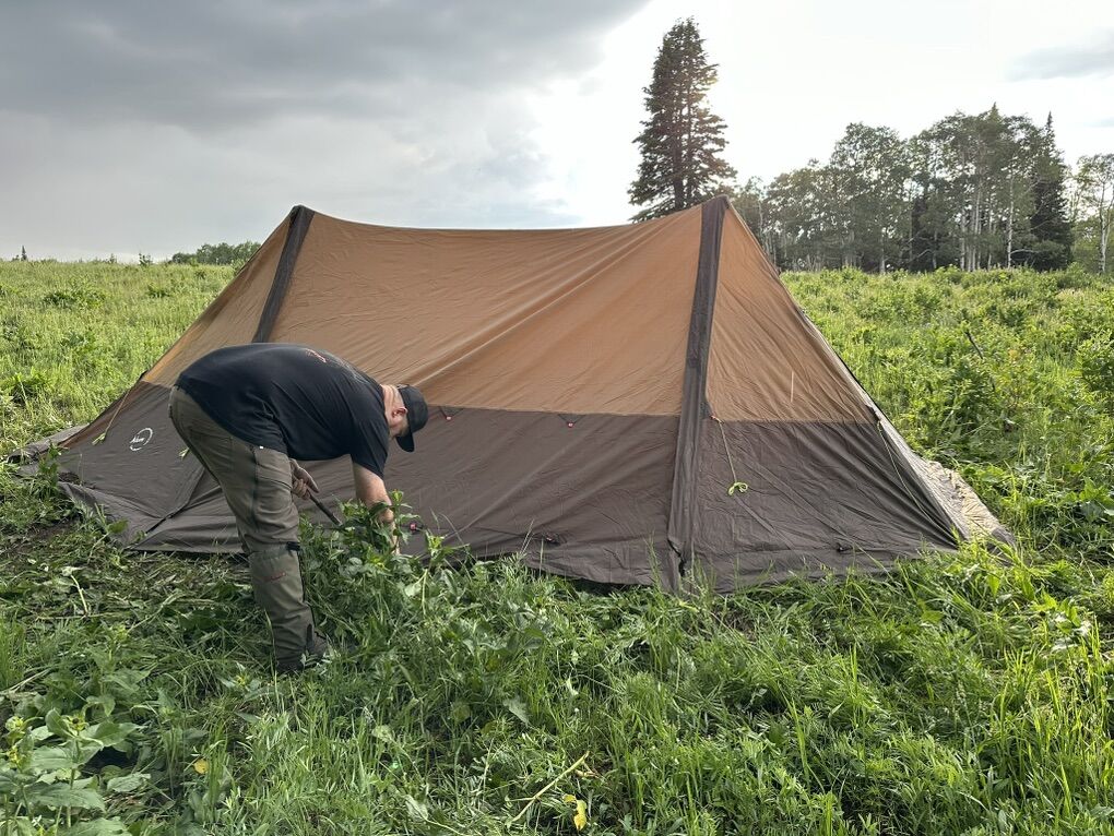 The Twin Peak Shelter hot tent sleeps four, three with optional stove. Includes two aluminum poles , Add one or two more to pitch the side panel as an awning. Great for hot days to cool off the tent and have shade. Only used twice, selling because I need something bigger for my family. No cuts or holes.