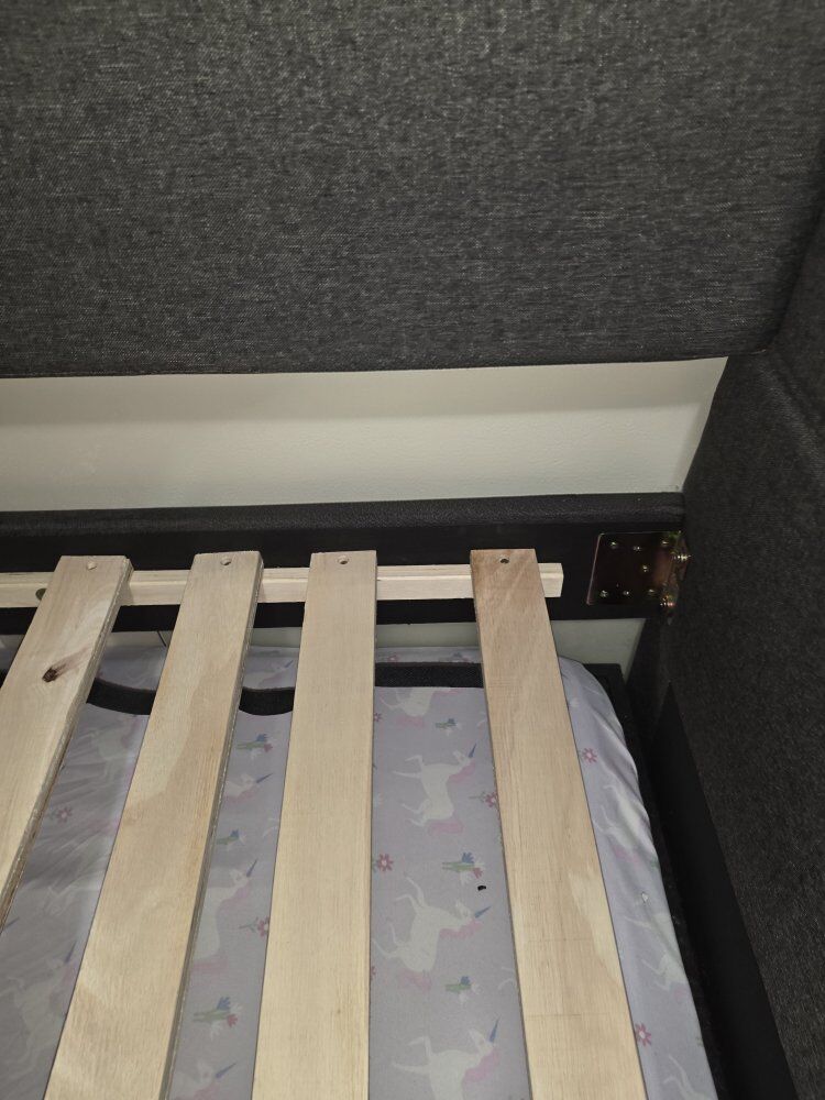 The only damage to the entire daybed frame is the wear and tear from the trundle bed the fabric split. If you are good at sewing it would be a quick fix. Or you could just take the trundle bed section out and utilize the space below for storage!!!