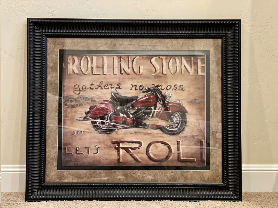 Framed Motorcycle Artwork about 40.5" wide by 34.5" tall