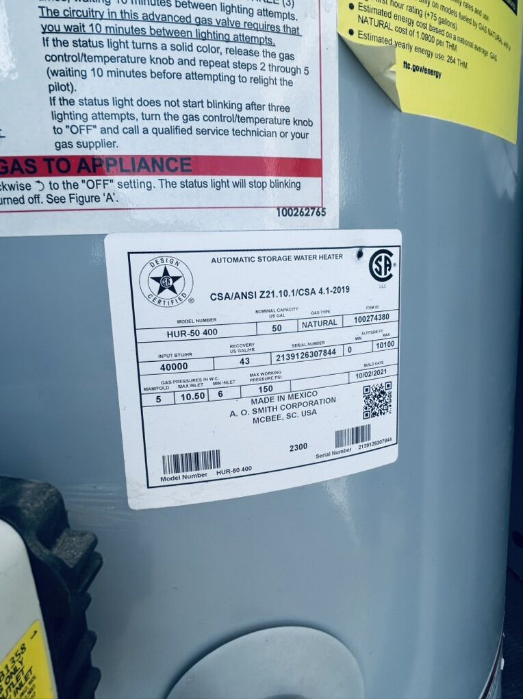 ApplePay2021, AO SMITH, 50 gallon, ultra low nox, standard sized water in excellent condition This is a 9 year manufacturer warranty which is covered until late 2029