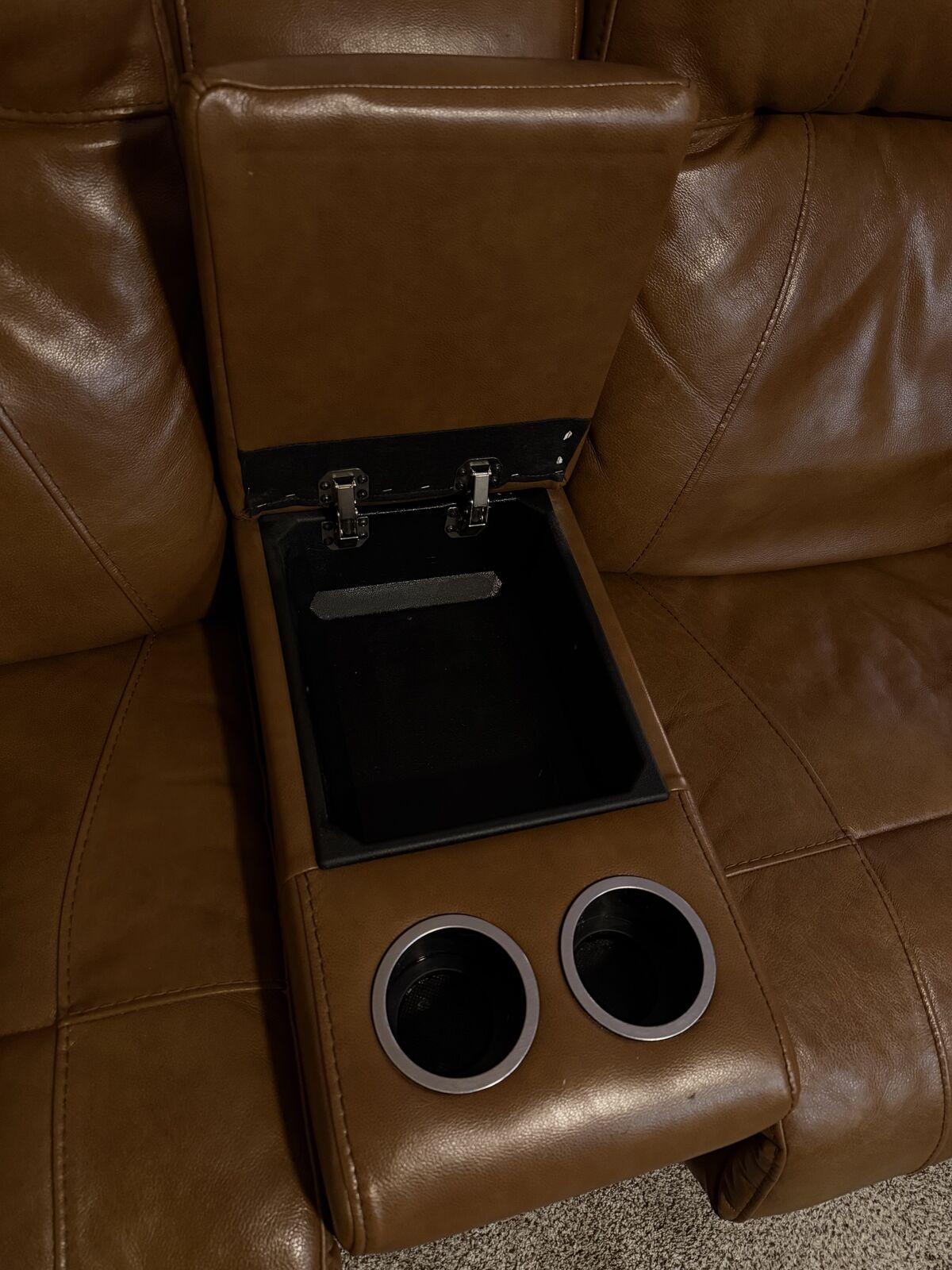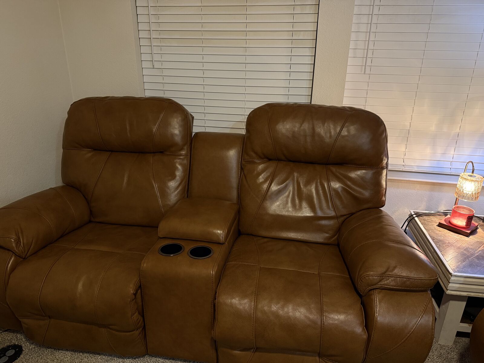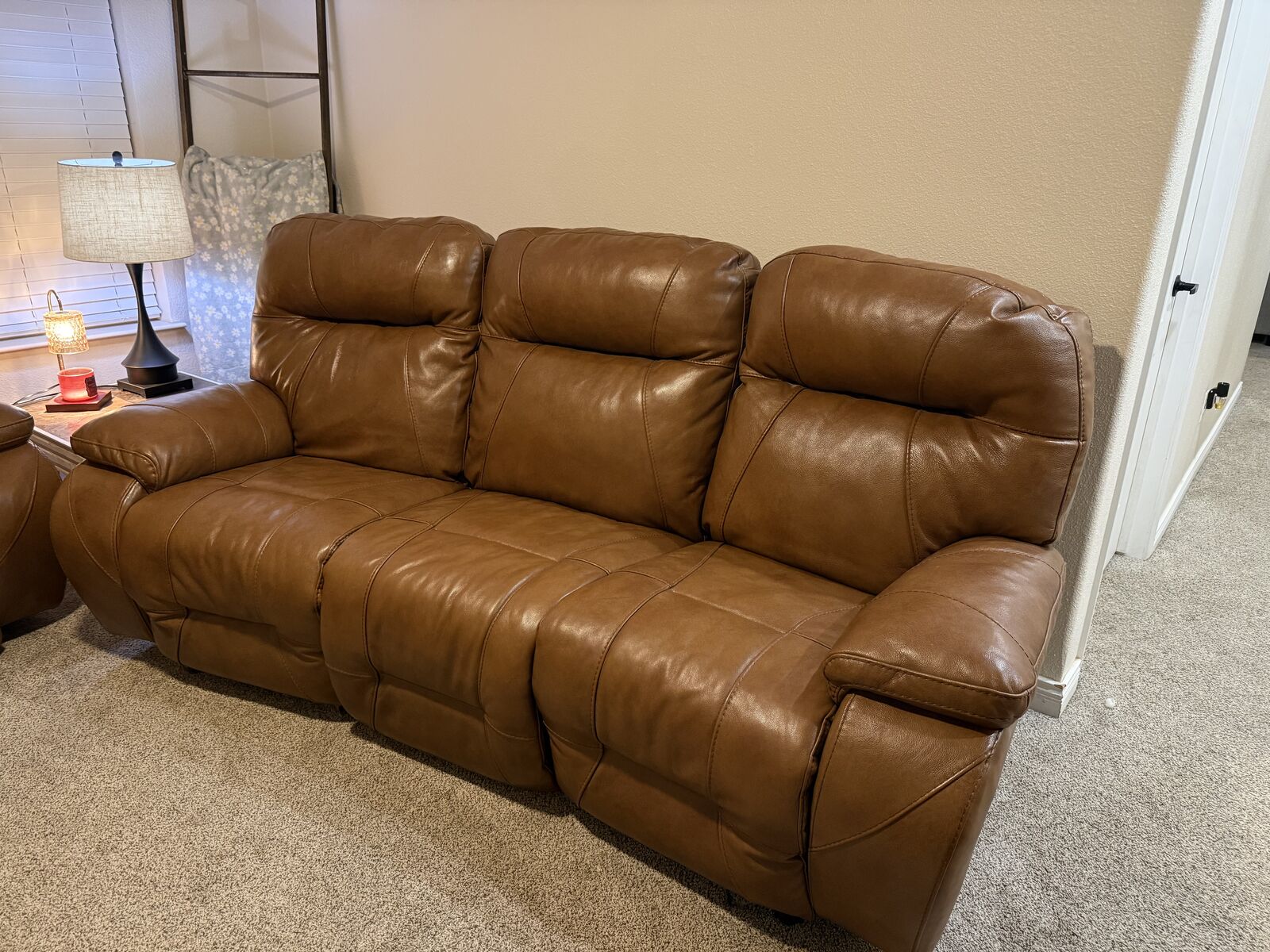 There is a small cosmetic scuff on the back of the sofa from reclining into the wall. Otherwise in great condition.