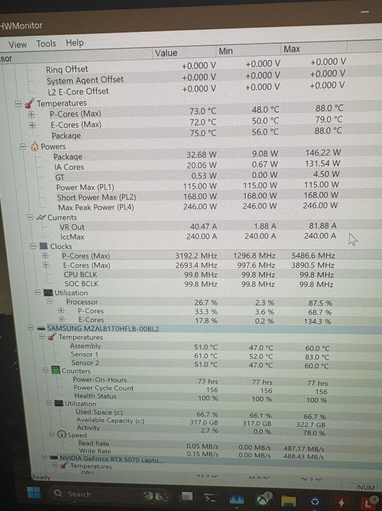 Has a 14th gen i7 with 28 threads, a 2.5k oled 165hz panel, rtx 5070 with wifi 7 card, 1tb n me and 16gb of ddr5 ram. Very nice laptop, it is in a 15” form factor and is surprisingly light and portable. Mainly selling as I didn’t like the numpad as I am more used to the Mac layout, looking to get a g16 because of this. But works great, laptop gets a little hot as Lenovo thought it’d be a good idea for the cpu to try to pull 150 watts and turbo to 5.4 GHz for some reason…but if you simply disable turbo boost, you’ll see it actually has a very solid cooling system. Can usually maintain cpu to 70 c and gpu 60c when gaming like this. Alternatively setting custom wattages to something reasonable and/or upping the fans also works. Battery has pass through charging and limiting to 80% which is good for health in the long run. Has 10 months of warranty left, both ram slots are upgradable and has an extra nvme slot free. Battery life isn’t the greatest as it is using the hx intel chip, but on eco mode and quiet settings, it drains from 18-30 watts on light work so you can get a few hours away from a charger, I usually ran on dgpu mode for best performance for gaming so didn’t really matter. Beat e33 on this, was a beautiful game with this screen, very punchy colors. Any questions let me know, feel free to meet up at a McDonald’s or something and stress test it or anything.