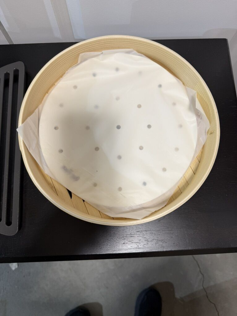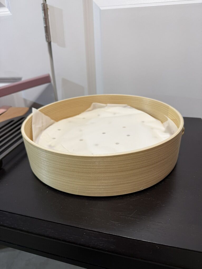 ZellePurple pan with steamer basket, grilling tray, spatula, chopsticks, bamboo steamer basket, and flipper plate. While there is no box, everything is brand new, never been used.