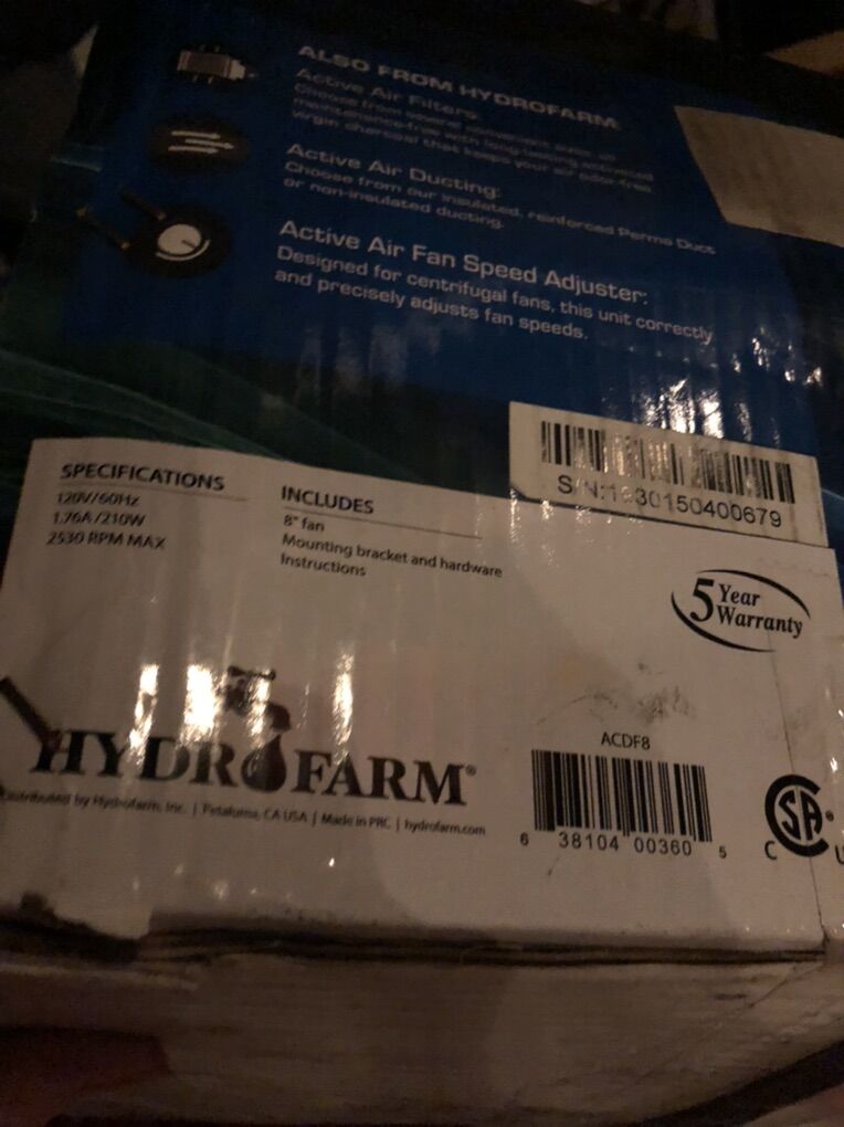 HydroFarm 8” Inline Fan 120V / 2530 RPM. In-line fan is great for ventilation purposes. Works great with cooling systems for high intensity growing lights. Fits 8” diameter ducts. Moves 720 cubic feet of air per minute. Durable ceramic- coated metal housing protects the fan and resists corrosion. Quite and efficient operation high quality molded Impeller. Thermally-protected AC motor. Incudes mounting brackets and hardware and an 8 foot pre wired 120V power cord. Also can be used for regular ventilation purposes for barns, sheds garages, houses, basements and much much more!!New in the Box!! $$140.00.