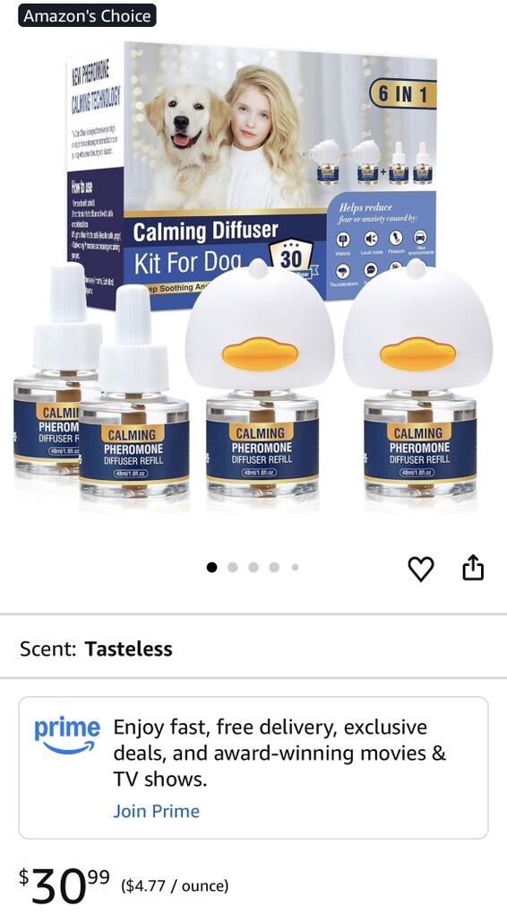 VenmoThis image shows a LKBHGF Dog Calming Pheromone Diffuser 6-in-1 Kit, which is designed to reduce stress and anxiety in dogs. • Components: Includes 2 plug-in diffuser bases and 4 refill bottles. • Duration: Provides up to 120 days of calming coverage. • Coverage: Covers an area of up to 700 square feet. • Features: Mimics a mother dog's natural pheromones to help reduce fear caused by fireworks, thunderstorms, visitors, loud noises, and separation anxiety.