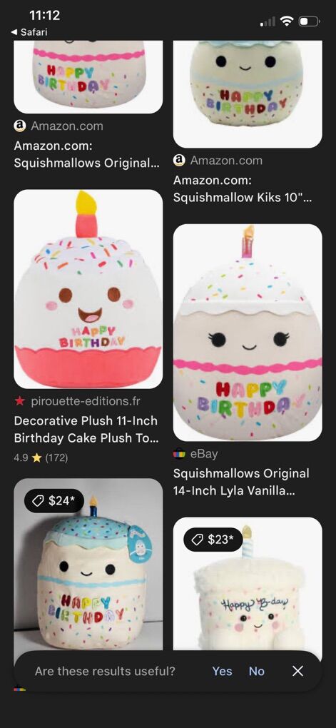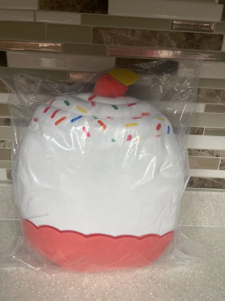 VenmoSquishmallows Birthday Cake Plush toy, described as an 11-inch decorative plush pillow. Brand: Squishmallows. Design: A white frosted cake with colorful sprinkles, a small candle on top, and a smiling face. Material: Made from soft, cuddly material suitable for snuggling. Usage: Perfect for decorative purposes or as a companion for kids and collectors.