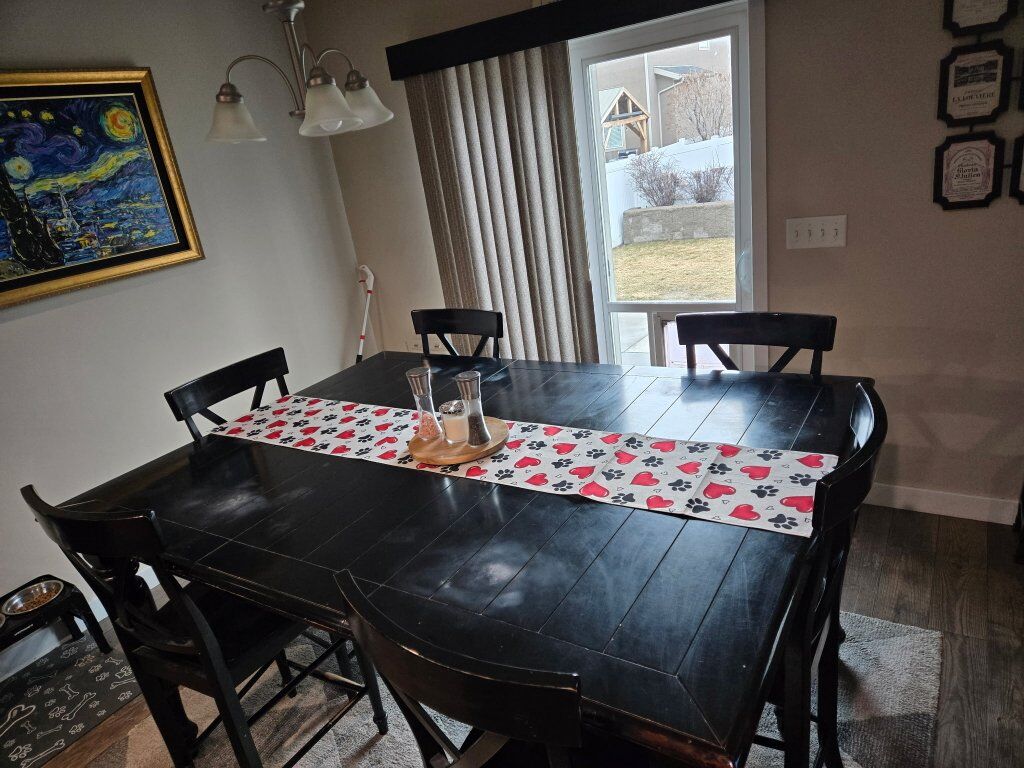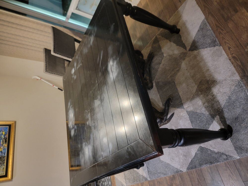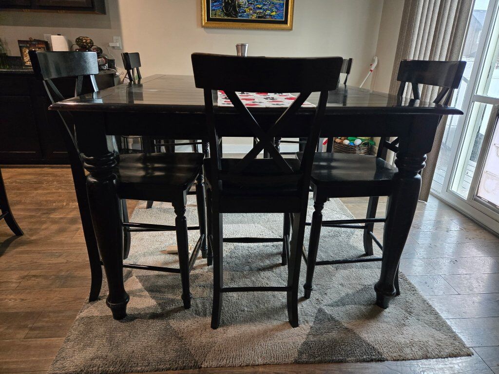 Black Counter Height Kitchen Table with 8 chairs built in 2006. Built-in hidden table extension leaf.