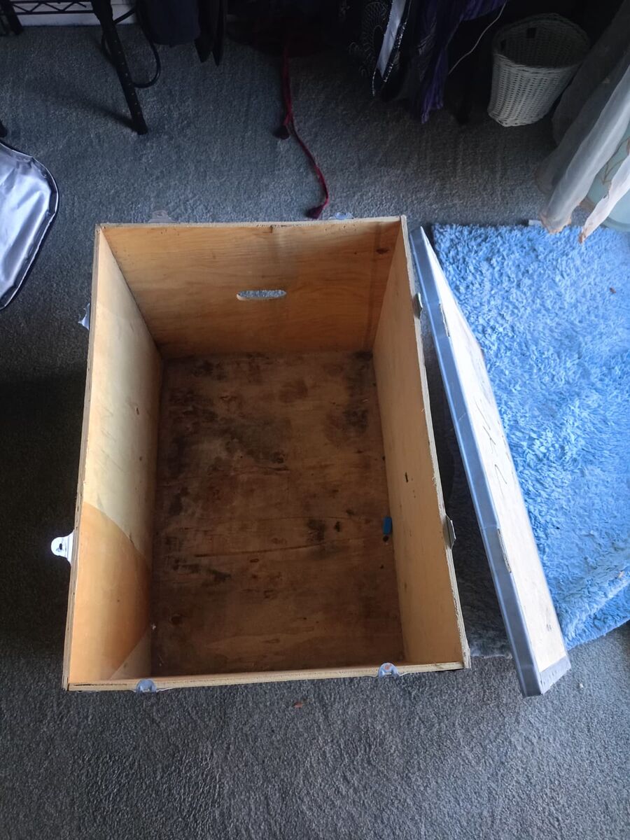 Solid wooden storage / shipping crate with removable lid and metal-reinforced edges. Originally used for transporting equipment. Very sturdy construction. the bottom is a bit damaged but will still work