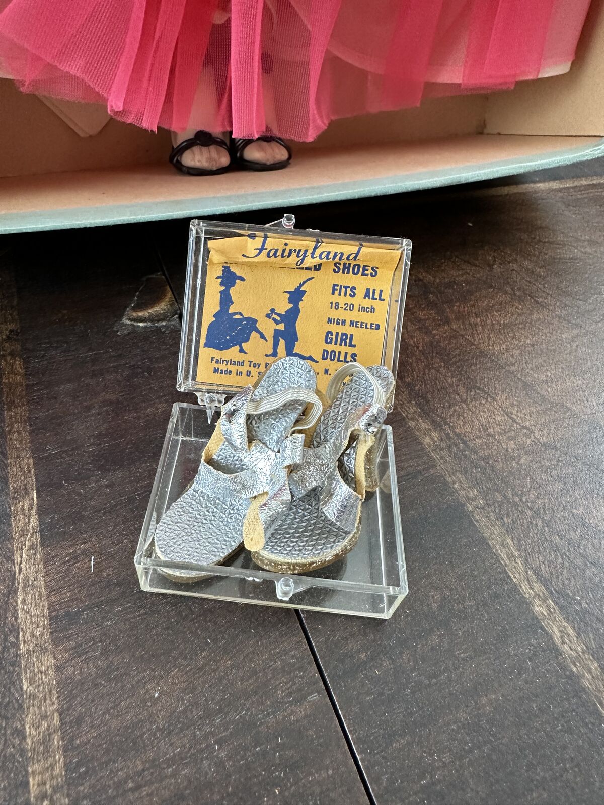 The doll's original accessories are included: earrings, a broach, and the hair-waving set. There is also an extra pair of golden high heel shoes.