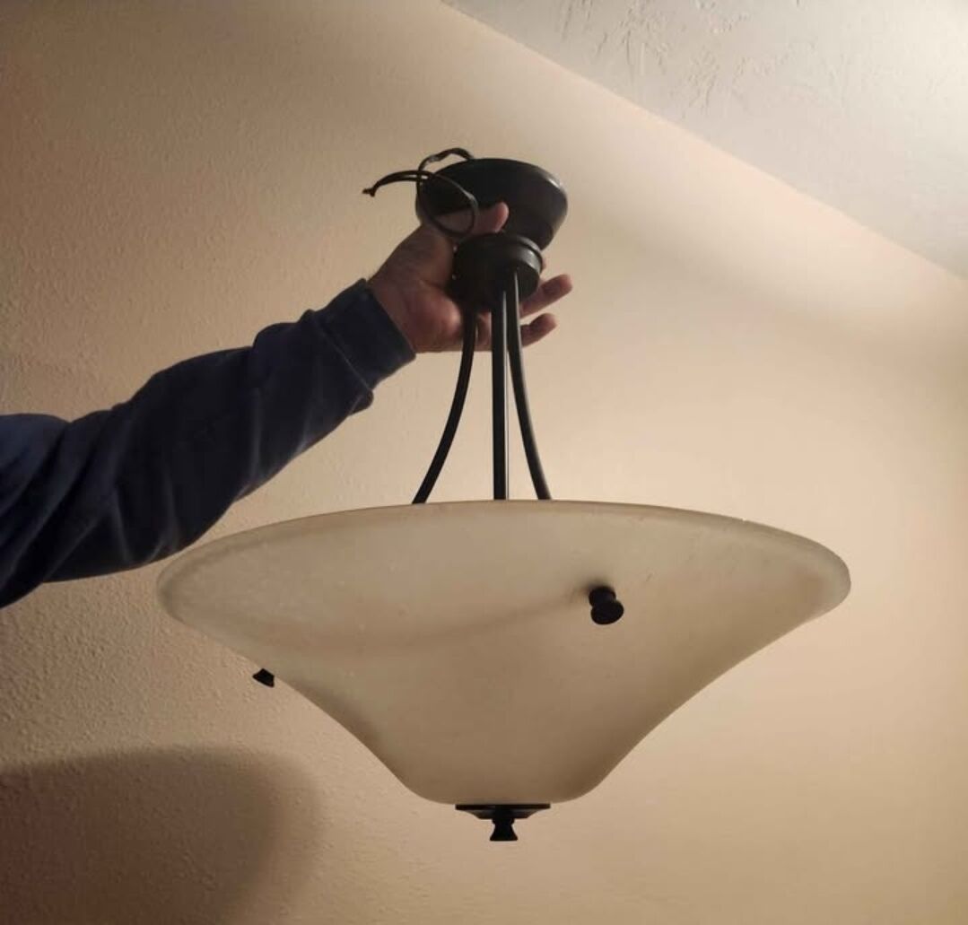 VenmoCeiling mount chandelier with frosted glass. Bronze plated. Used but looks new.