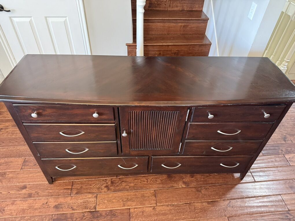 Venmo66 x 19.5 x 36 in., deep cherry stained dresser. In good condition with some minor scratches. Drawers are on single rails and open and close smoothly.