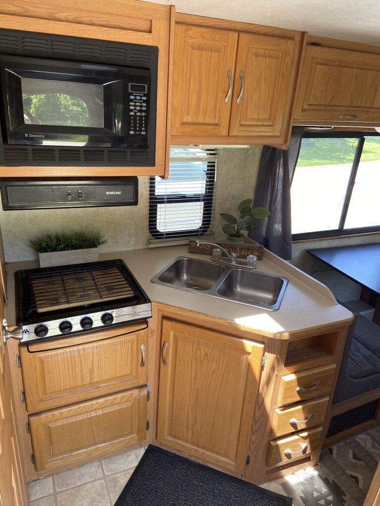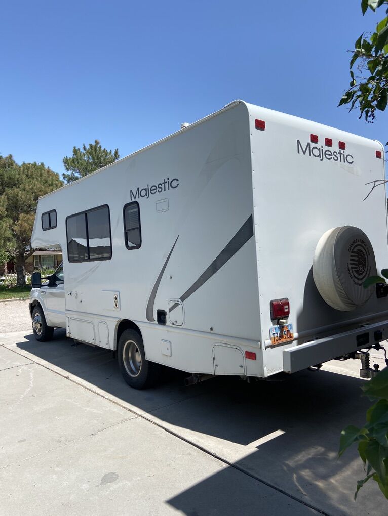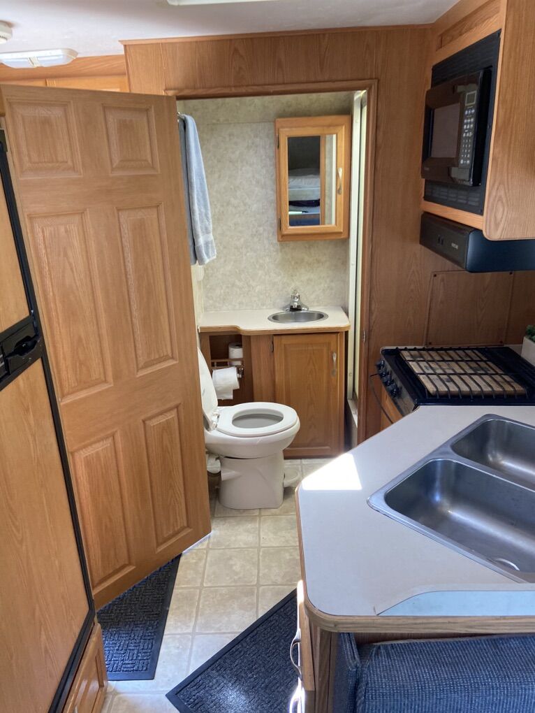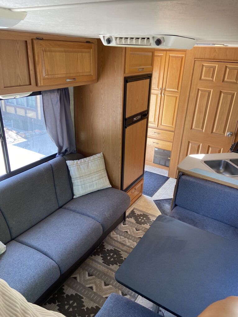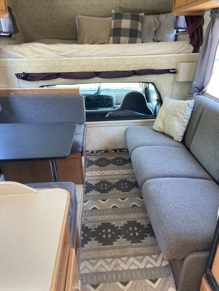 ZelleRare short RV, just 23 feet bumper to bumper! Sleeps 4 comfortably- the couch and table can be used as bed and there is a bunk above the cab. The back can be accessed through the cab. Full disclosure: there is water damage on the top right side of the bunk. It’s been repaired- however there are still signs of damage if you lift the mattress. There was also a leak in the window above the shower. With the exception of those- the coach is in great condition and drives well. We have never had any break down problems or issues with anything mechanical, electrical, or plumbing. Mileage on truck- 154,569