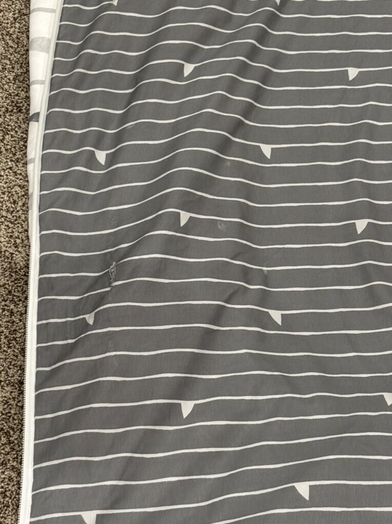 Full Great White. Has 2 shams and 2 cases, small holes in sheet as shown and a few faint dirt marks. FEB30