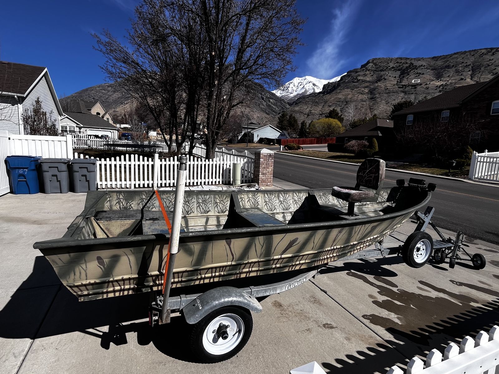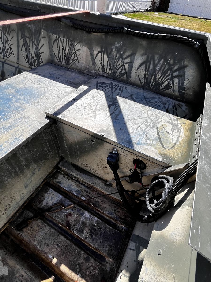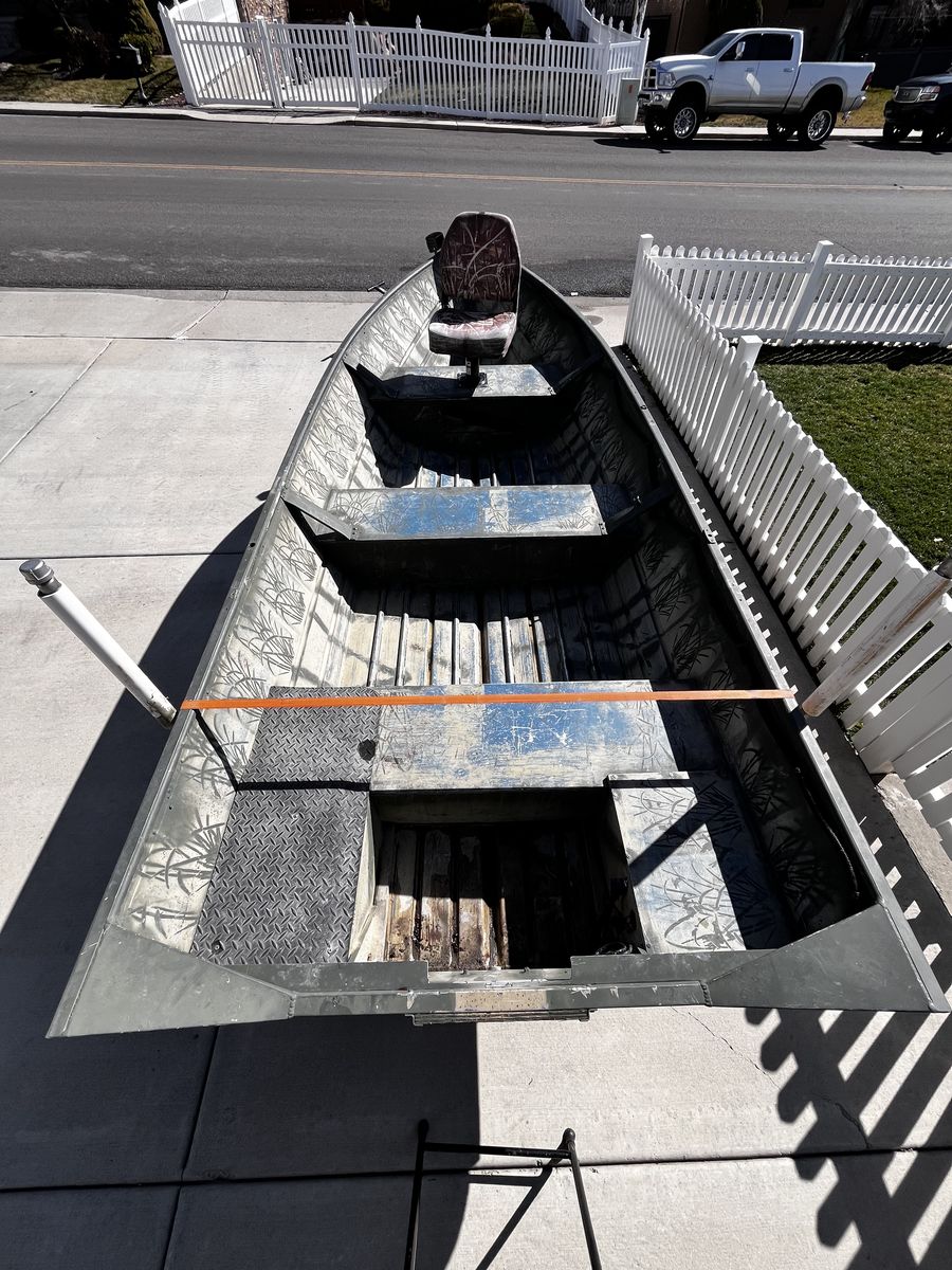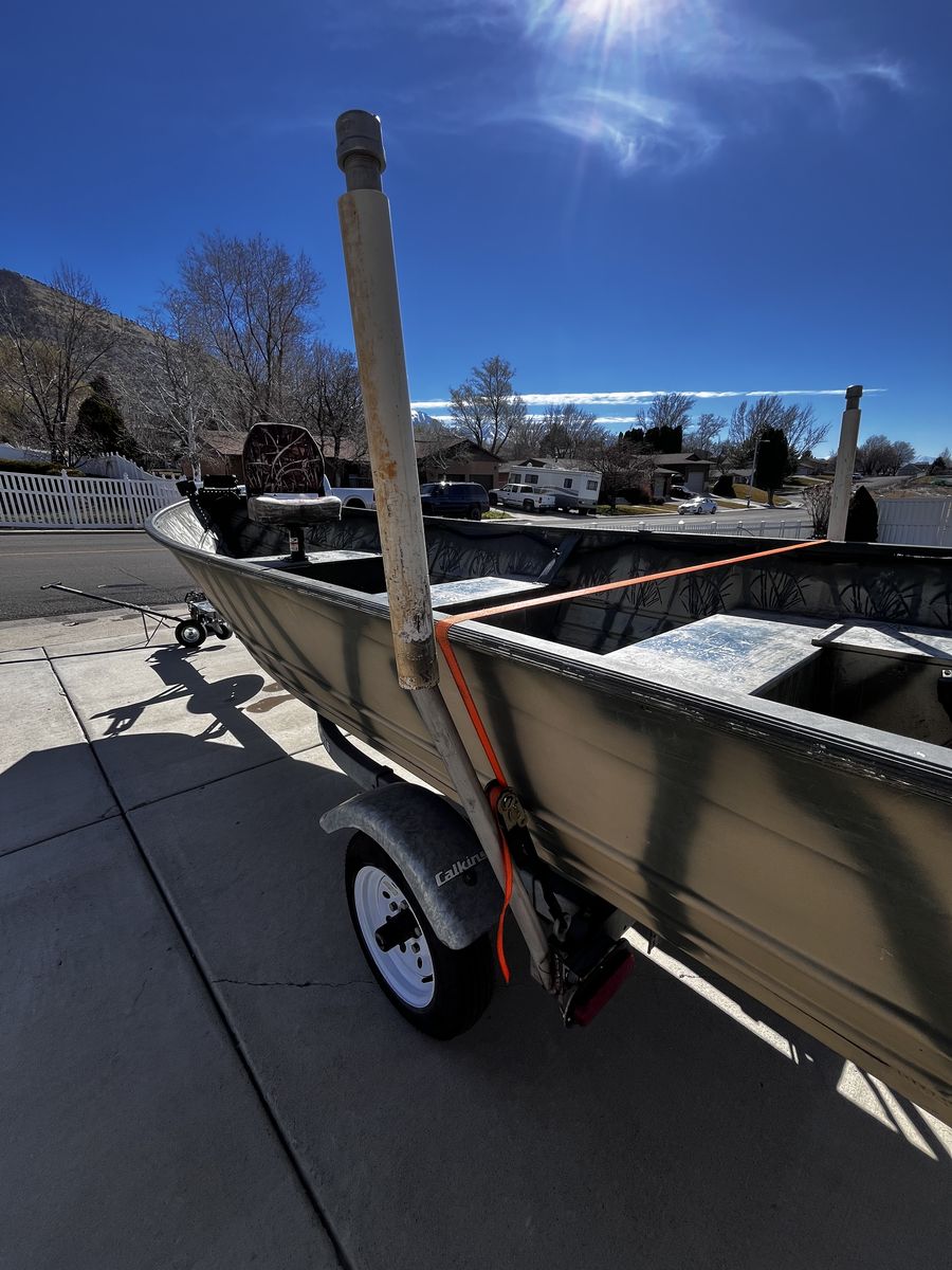 VenmoFor Sale—14 foot Kalamath aluminum v hull boat. (NO MOTOR) Boat is flat bottom in the rear and can go in very shallow water. Boat is 48 inches wide at bottom and very stable. Welded no rivets. I have hunted 3 adults, dog and 4 dozen decoys out of boat. It did great. Kalamath is known for their stability and solid build. No cuts/repairs in aluminum hull. Boat comes with a brand new battery, paddle, machete, fish/bait cutting pad, front fishing or hunting seat with pedestal, front LED running lights (that work), also a boat cover. TRAILER—Calkins brand with 3 brand new tires and rims, spare tire mount, trailer loading guides, newer carpet on bunks, new loading crank rope, loading trailer frame step plate, front jack, bearing buddies. (Recently greased) boat strap & tie down strap hooks, all trailer lights work. This boat is registered until 6/26. This boat is ready to go fishing this summer. (Boat & Trailer, No Motor). ASKING $1,100.00. Or Best Offer. Thanks for Looking.