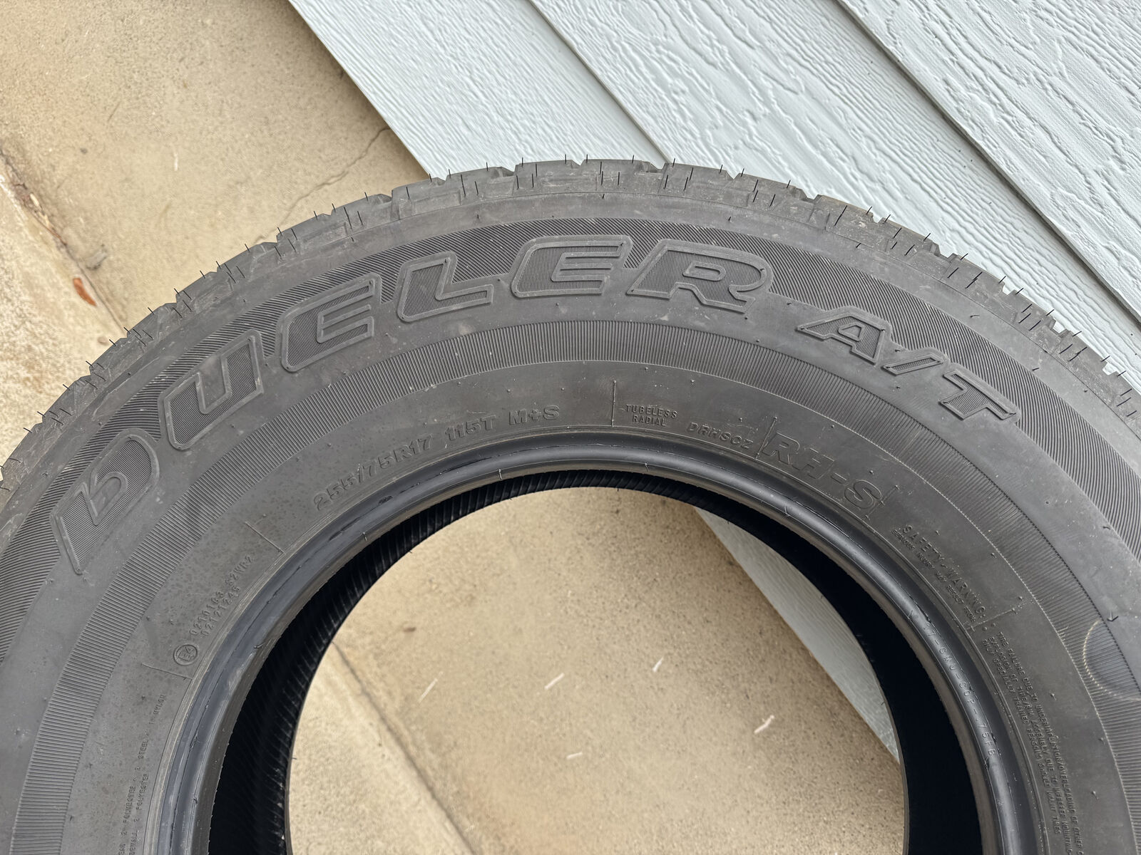 VenmoBridgeston Dueler AT M+S tires size 255/75R17 from a Ford Bronco. They have approximately 2700 miles on them. 5 Tires in total. One has be recently plugged for a screw puncture in the middle of the tread.
