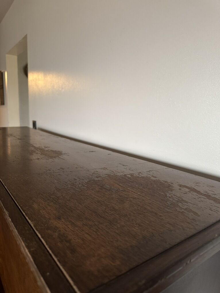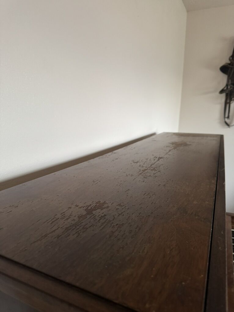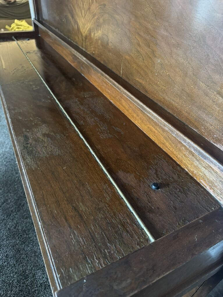 There is some cosmetic aging and water damage on the top surface from previous owners who watered plants on it and had children. When we purchased the piano, the tuners thoroughly inspected it and assured us that no water entered the interior — the wear is purely surface-level and cosmetic. We’ve always kept it styled with décor on top, and it has never affected the sound or function.