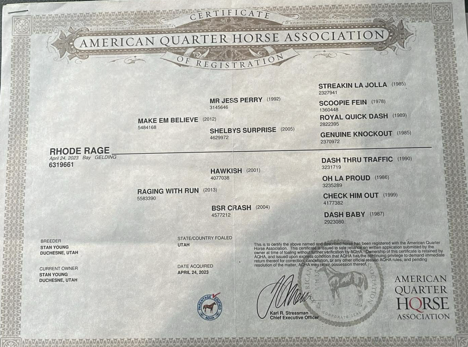 ZelleRhode Rage is a 3 year old AQHA bay gelding son of Make Em Believe (si 98), a son of the legendary Mr Jess Perry, and out of Raging With Run, an earning daughter of Hawkish (LTE $685k+).