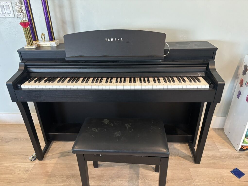 Read more about it on the Yamaha website. This piano is currently being sold, not an older model. The little bench is included if you want it. It has kid marks and wear on it but the piano is included perfect condition.