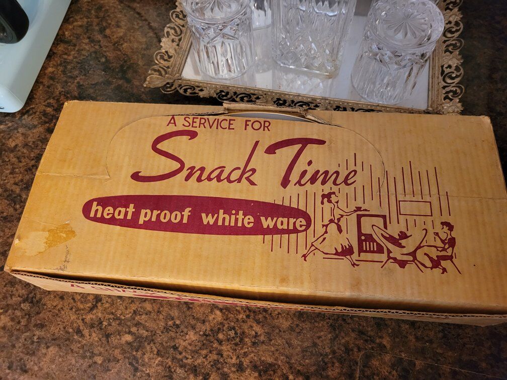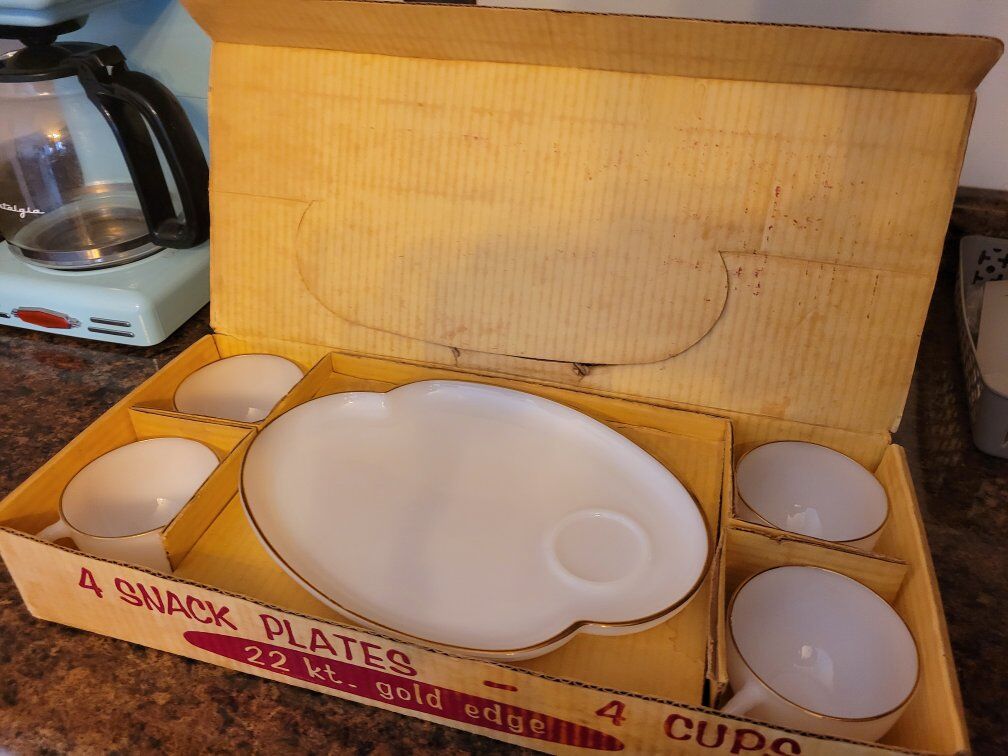 Vintage in original box. 1950's 22kt gold Snack time set. Perfect condition. No chips or cracks. Beautiful set. These sets can go for upwards of $150. It has been sitting in storage and I would love for it to go to a fantastic home. 4 cups and 4 plates. Gorgeous white, rimmed with 22kt gold Located in Corinne.