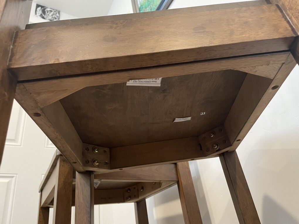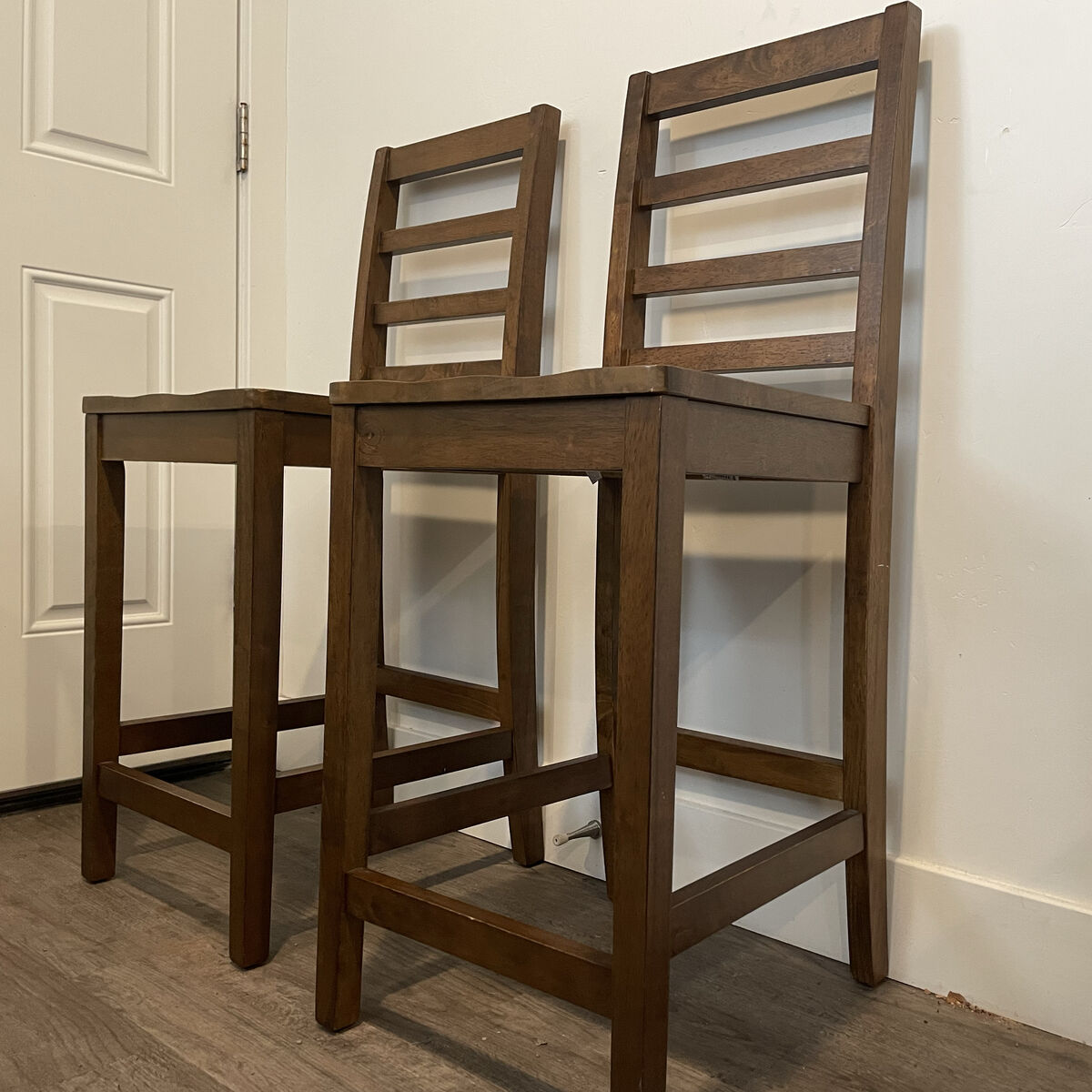 Beautiful 24” counter height stools Very comfortable with a solid build Stool backs are 40.5” high I believe the color was called special walnut I would say it is a light medium brown with a small hint of red and gray The close up pictures show the true color best
