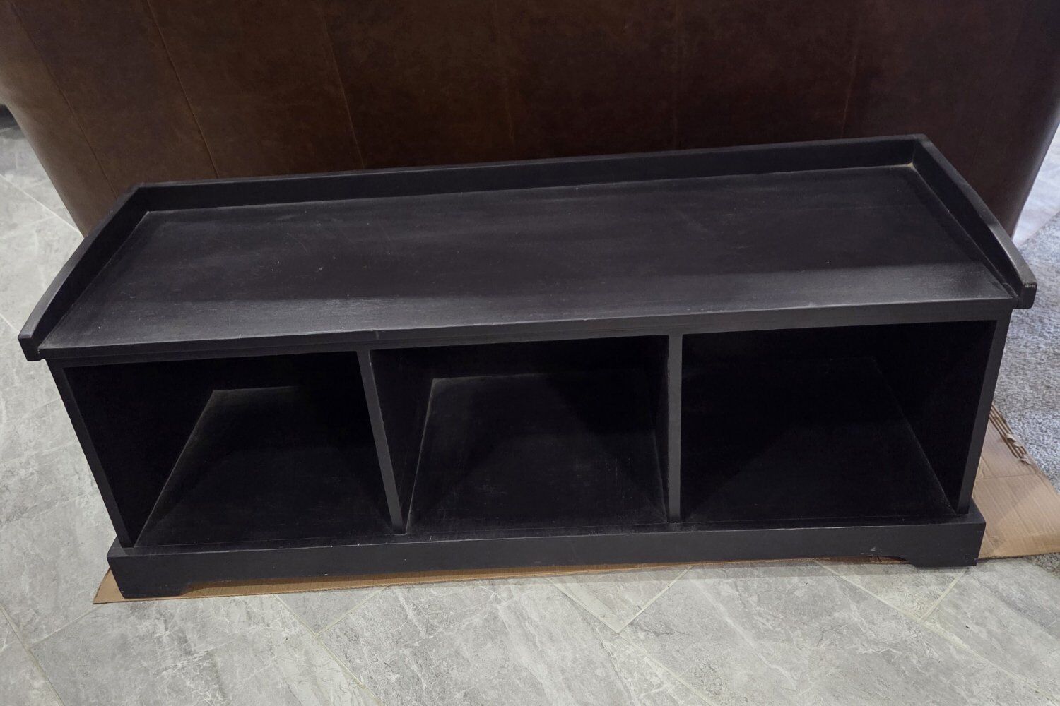 VenmoSolid, sturdy black bench with cushion and 3 cubbies. 50" W 19" H 17" D