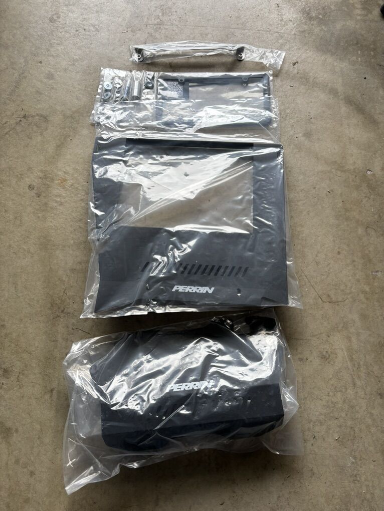 This kit is brand new, I did a test fit over my aftermarket COBB intercooler and it didn’t fit with that specific intercooler. A tiny bit of paint chipped off on the intercooler shroud when test fitting on the top left corner (as shown in the picture) but will not be noticeable at all when installed because that part will be covered up. This kit goes for around $300 after tax and shipping. My loss is your gain.