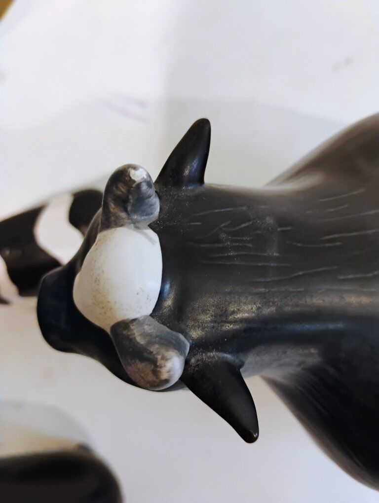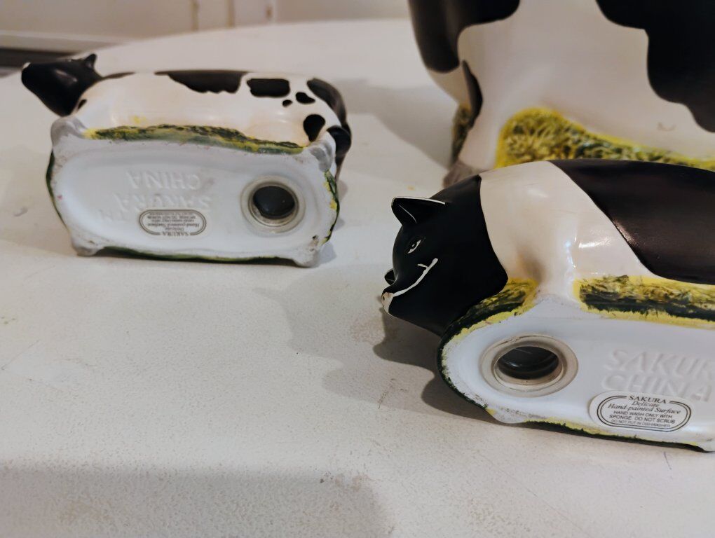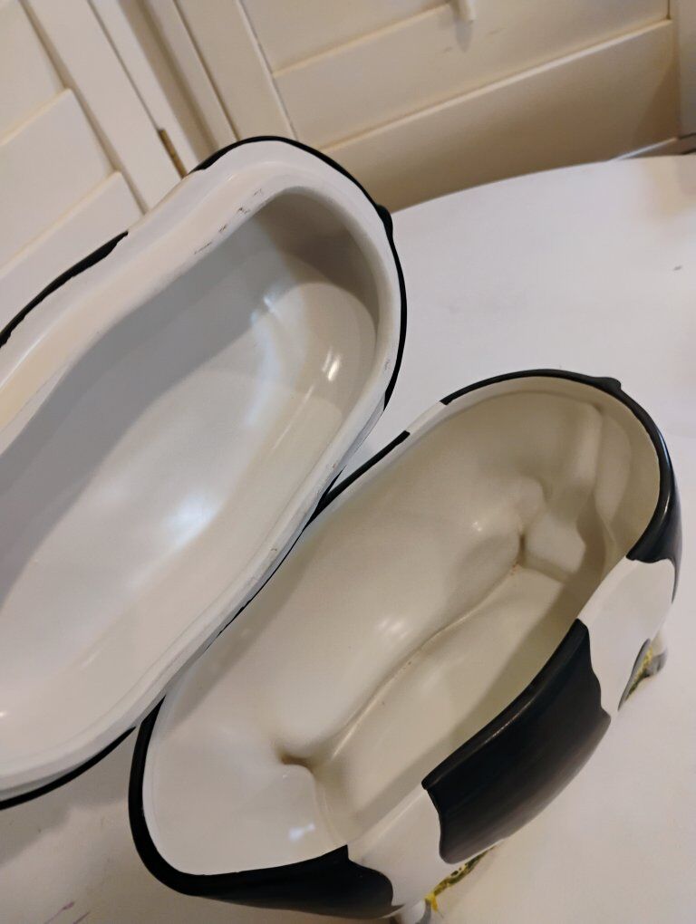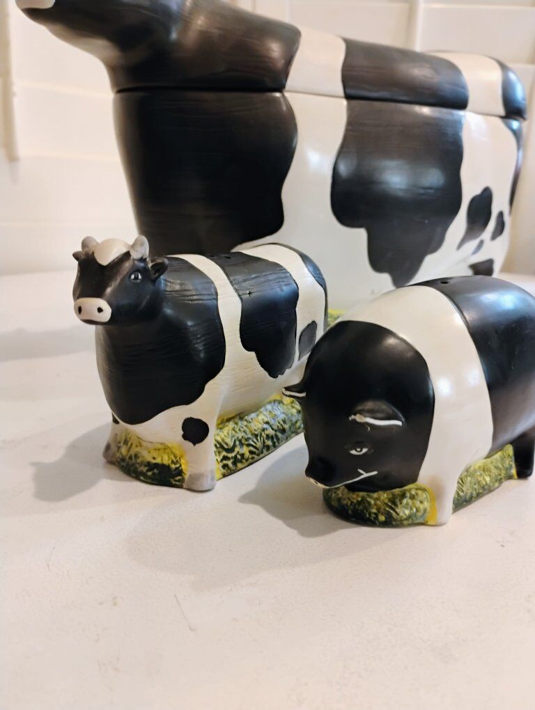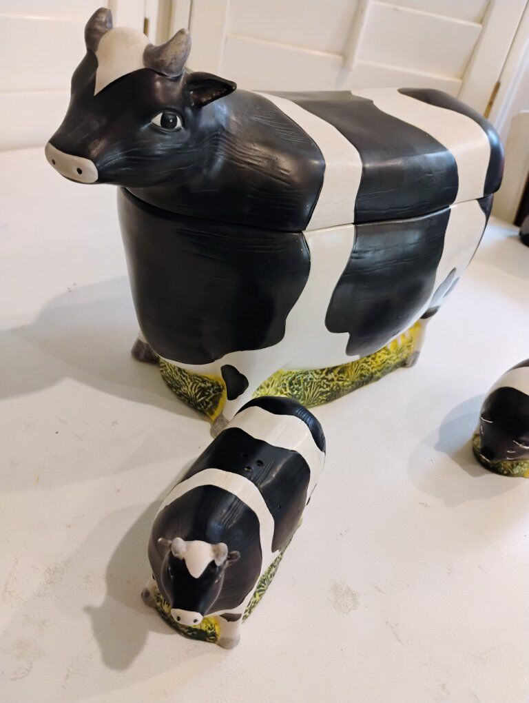 Warren Kimble - cow canister / cookie jar set, hand painted and rare. There is a little of wear on the cow's horn (as shown in the picture) but no other damages and it's in good used condition. This cow is ceramic, and she is quiet heavy. We will meet in Sugar House. Cash only. Let me know if you have any questions.
