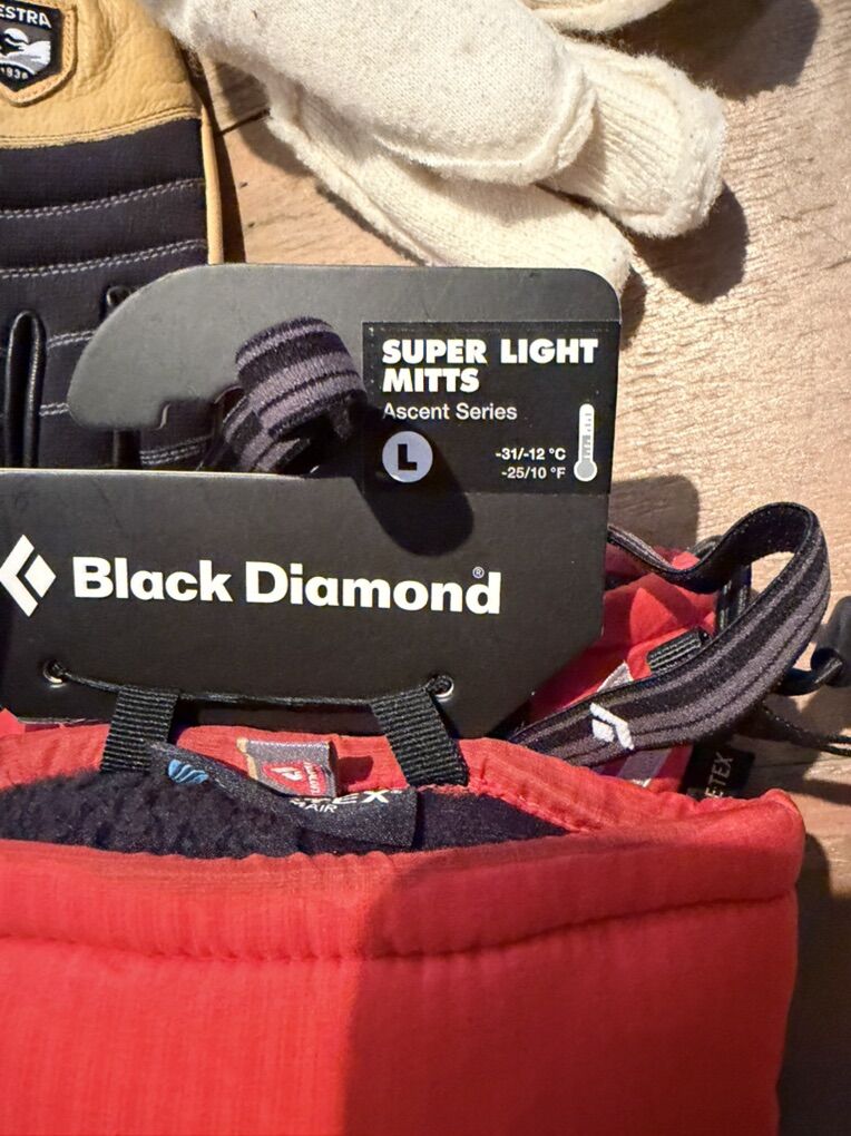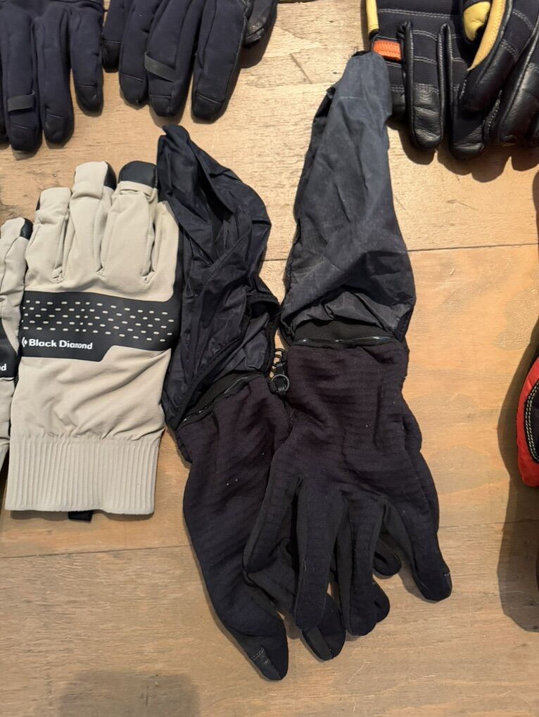 Selling all of these gloves as a set, size large. Mostly black diamond, but it includes 1 hestra glove. Ask questions about any glove, but I'm selling the entire set for $200! That's a great deal. The hestra gloves are unused.