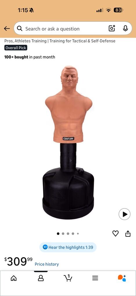 From Century Website: A great partner for sparring techniques or target work, the original BOB - Body Opponent Bag is a life-like mannequin with a vinyl skin for more realistic self-defense training. BOB features seven height adjustments from 60 inches to 78 inches tall. BOB can be used with or without gloves, and is ideal for punching and strikes. Made for home use.