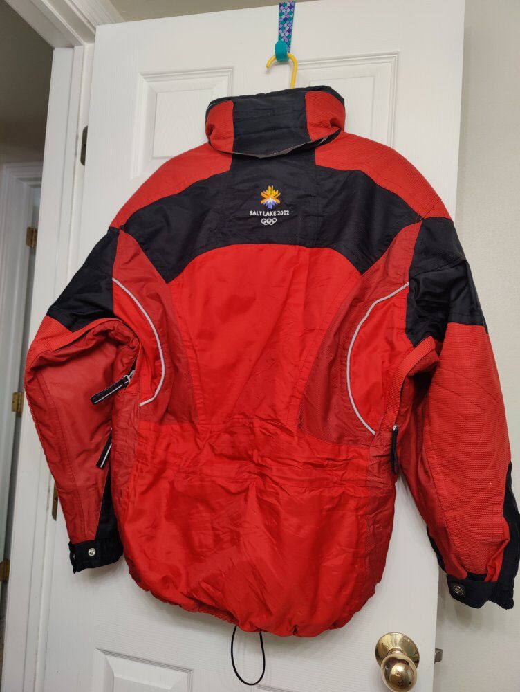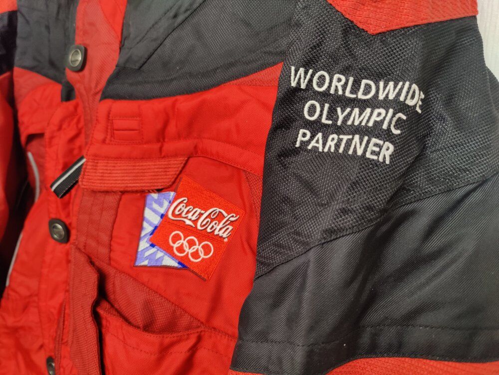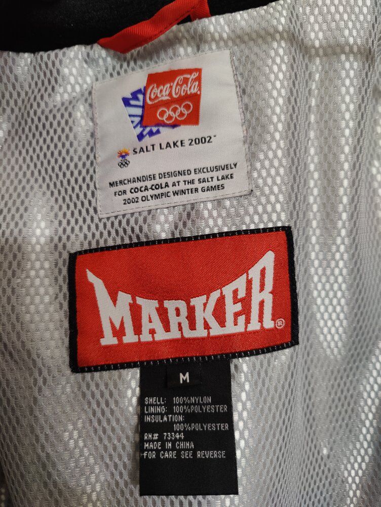 GooglePayRare Red with black accents Size Medium vintage 2002 Salt Lake Olympics Coca-Cola Marker Ski Jacket in like new condition. No holes, stains or defects. Great collectors item or perfect for any winter activity. I've seen a lot of the black with red accents not many of this design.