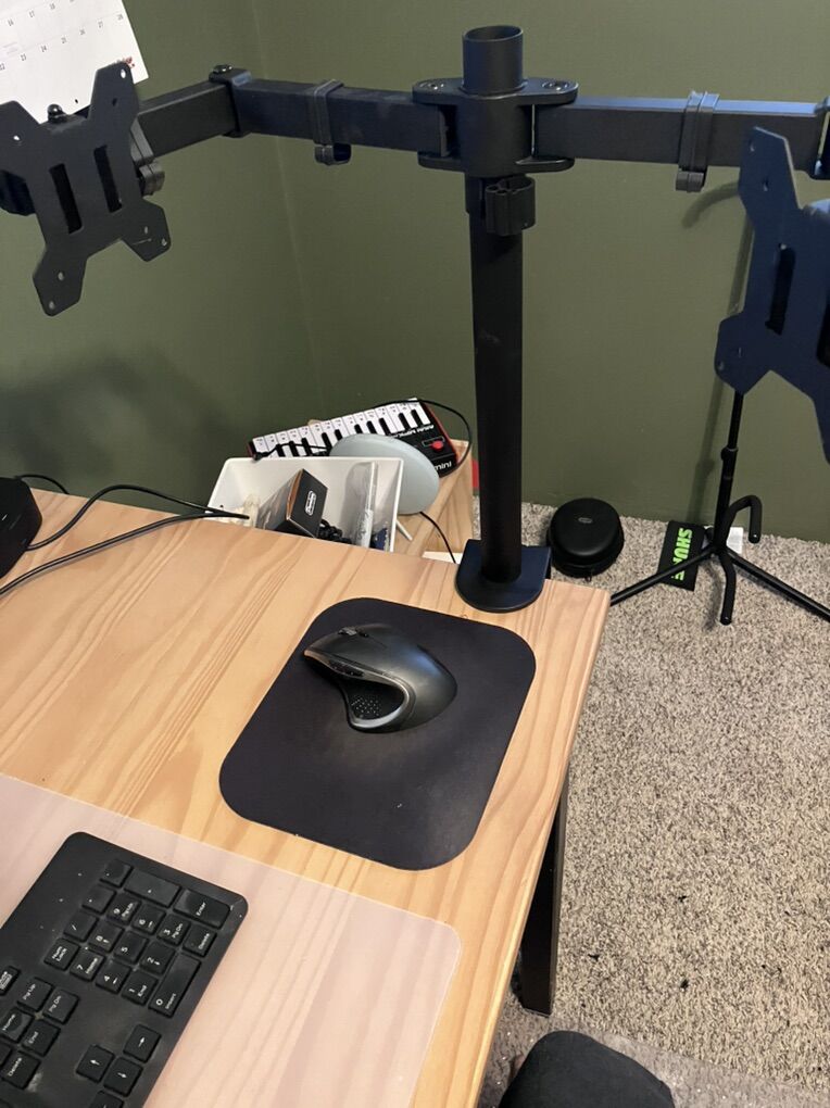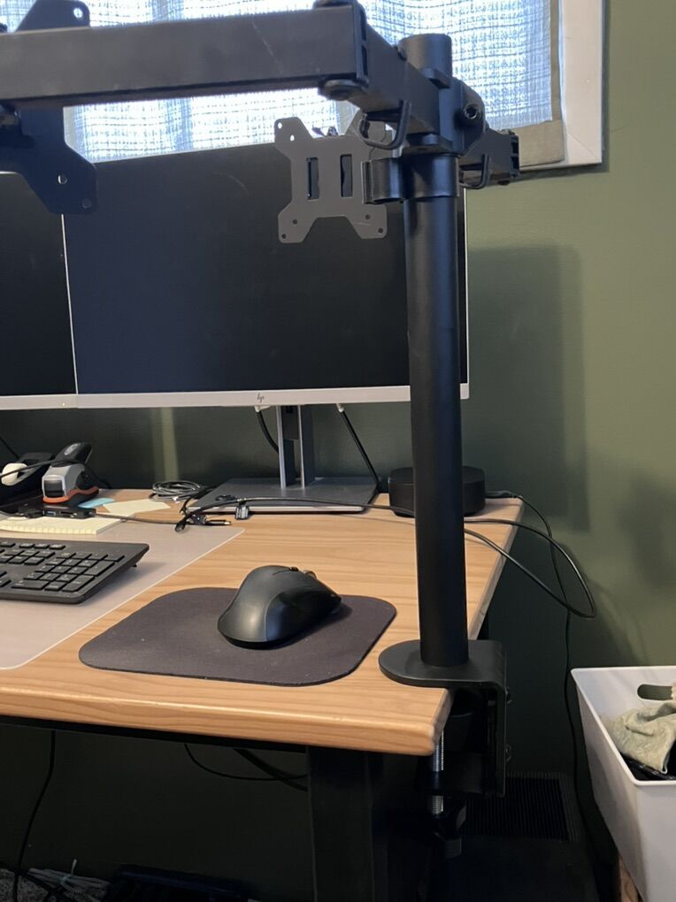 Description: Clear up your desk space and improve your ergonomics! I’m selling this sturdy dual-monitor mount in excellent condition. It lifts two screens off your desk, giving you more room to work and allowing for the perfect viewing angle.