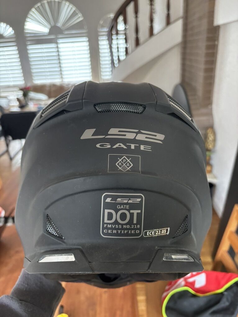 Helmet is a LS2 Large matte black, DOT certified helmet. No crashes, no dents, no scratches. Asking $60 paid about $150 a year ago. Comes with carrying case to keep her clean.