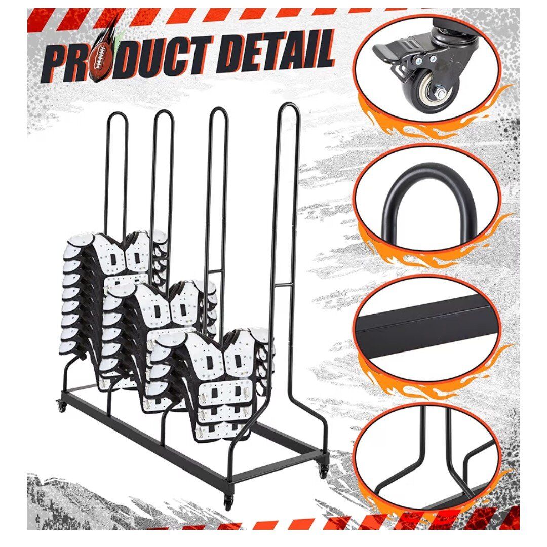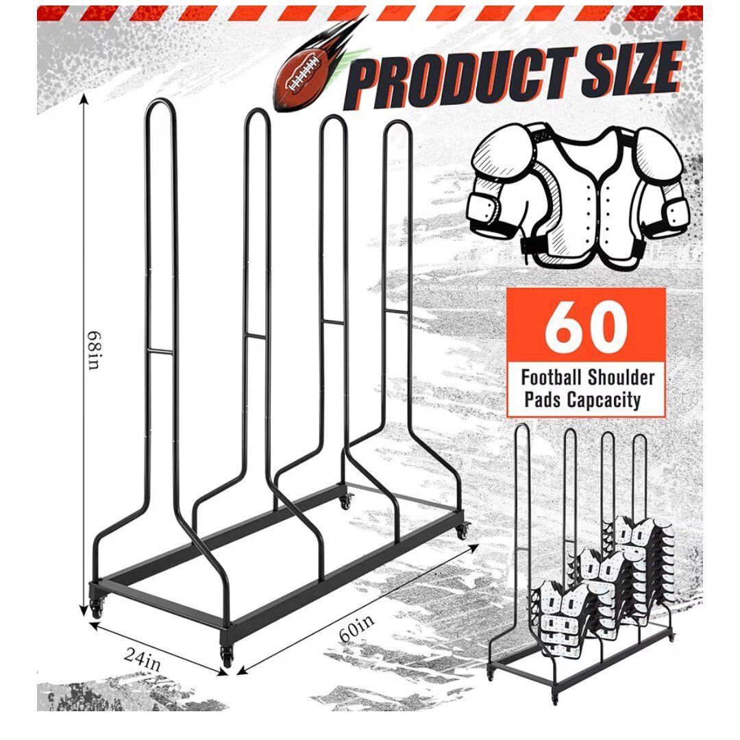 PayPalNew in box. Brand: Morningro Material: Iron Color: black Special Feature: Lockable Wheels Box Dimensions: 60.63"D x 10.24"W x 5.51"H Shelf TypeHolder Style Number of Shelves4 Effortless Mobility: our football pad storage includes a heavy-duty steel frame with retractable handles and lockable wheels, enabling seamless transport on and off the field while maintaining equipment cleanliness and operational condition Straightforward Setup: this utility cart, with its uncomplicated design, offers easy assembly and movement; It ensures effortless access to mats, supports increased storage, and enhances drying, sanitation, and odor management Robust Construction: crafted from sturdy iron, this equipment storage rack is designed for heavy loads; The solid steel frames and columns deliver strength and stability for reliable performance Organized Storage: keep shoulder pads off the ground to reduce odor accumulation; The bottom positioning rods allow for neat stacking, accommodating up to 60 shoulder pads for efficient organization Versatile for All Levels: measuring 24"W x 60"L x 68"H, $200 OBO