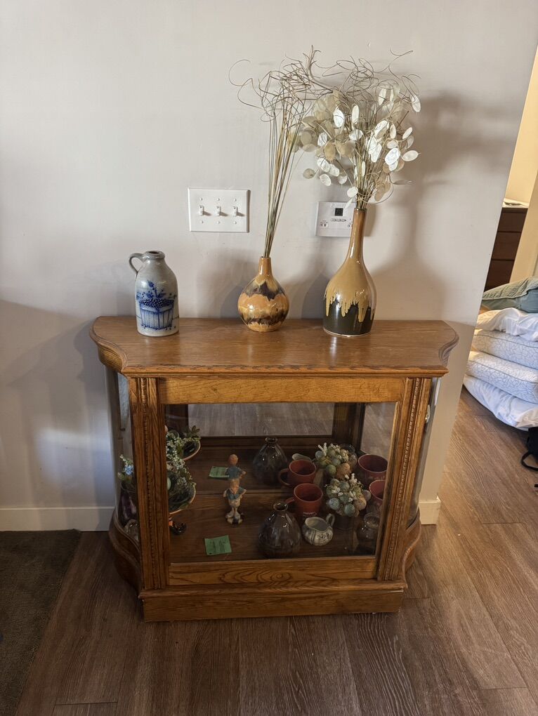 It has a unique door that opens left and right. There is room for a glass shelf if you want to put one in.