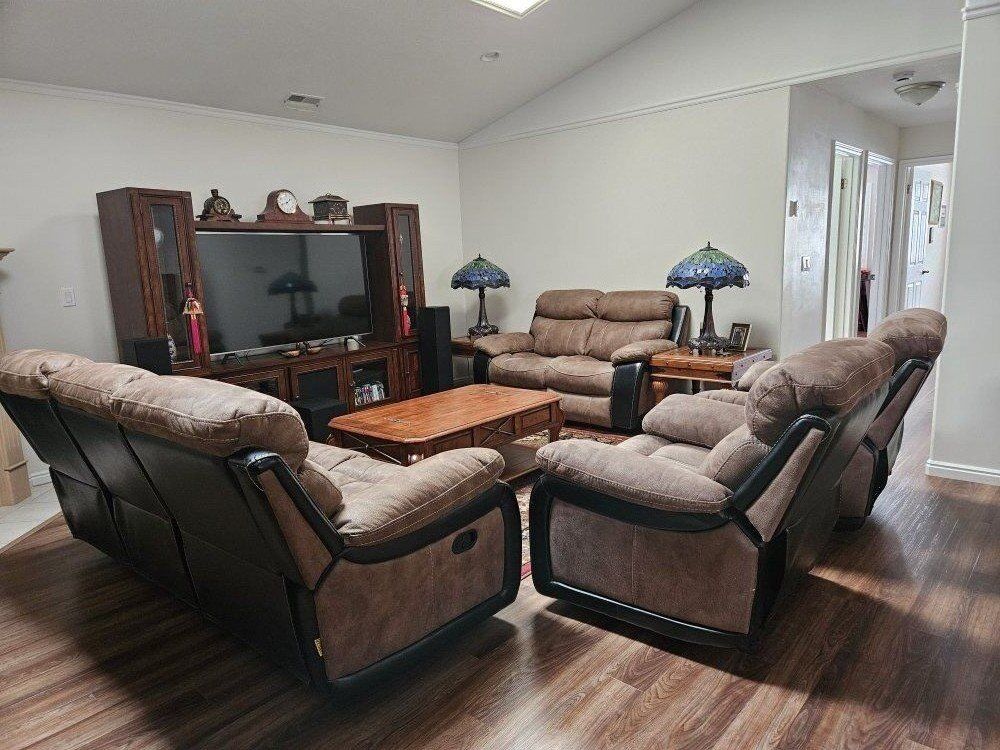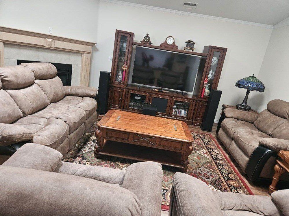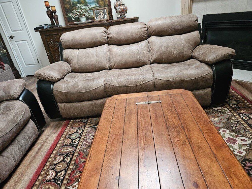 Suede/leather couch, love seat and 2 recliners. Couch and love seat have 2 recliners each for a total of 6 recliners. Set is like new and is in excellent condition. Asking $1950 but will negotiate.
