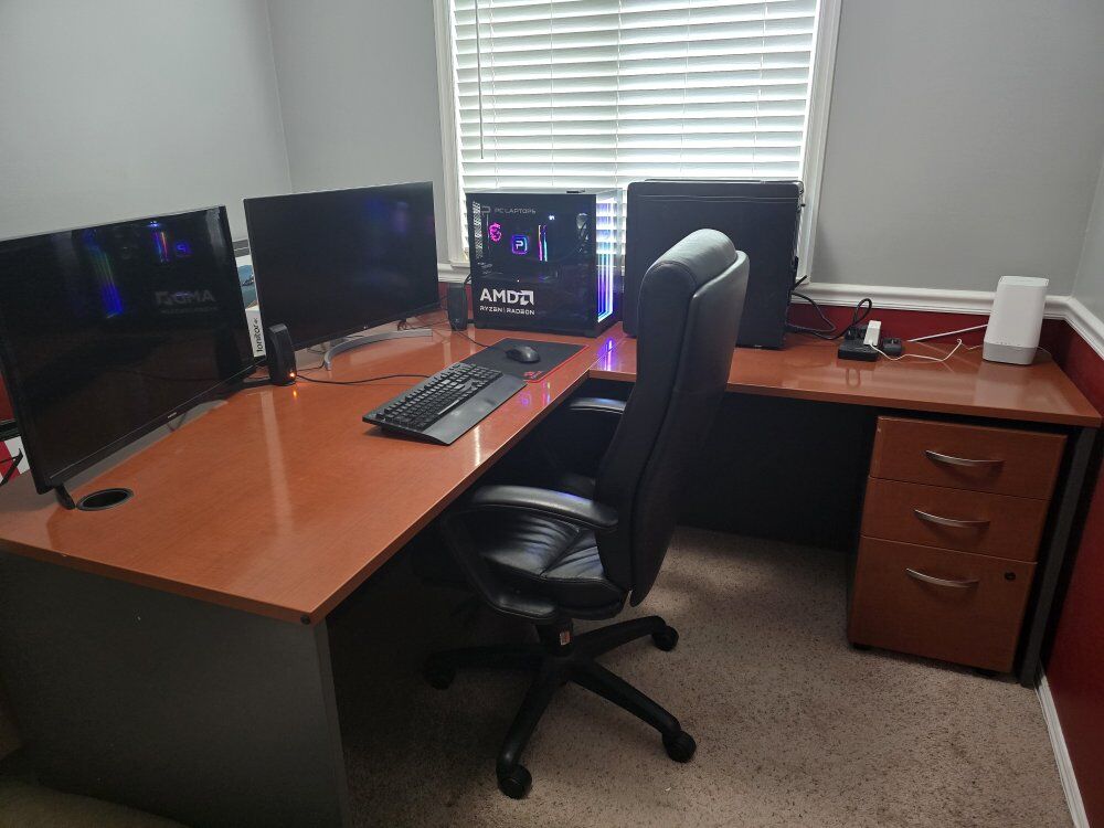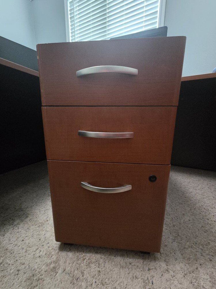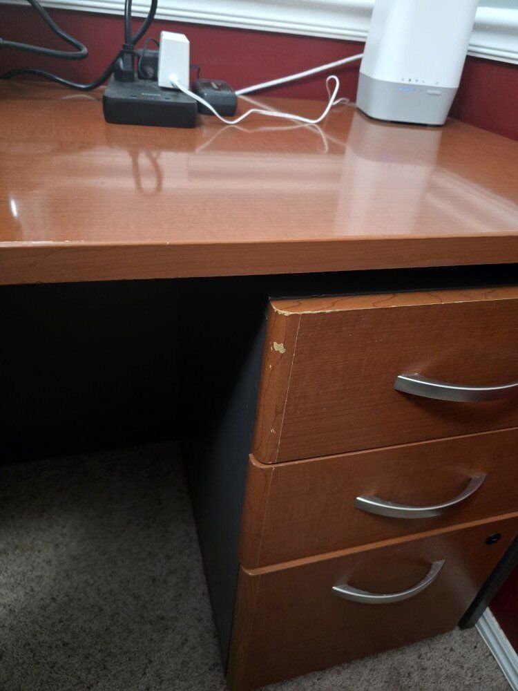 CashAppMake your home or work office look like an early 2000s Executive's office with the warm and regal wrap around desk! Visitors will be impressed by the size and girth (giggity) of your desk and will know that you have taste and mean business. It comes with a filing cabinet and drawer set that you can put anywhere! As well as a bookcase worthy of Law Books you may or may not have read, and DVDs that are dwarfed by how big it is. To summarize, this office set will separate you from the flimsy Ikea stuff that wasn't put together correctly with an impressive show stopper in and of itself. Serious offers will be considered. Pick up only. We can help a bit, but please bring a friend. A few chips shown in pictures. The early 2000s are making a come back, baby! Yeah!