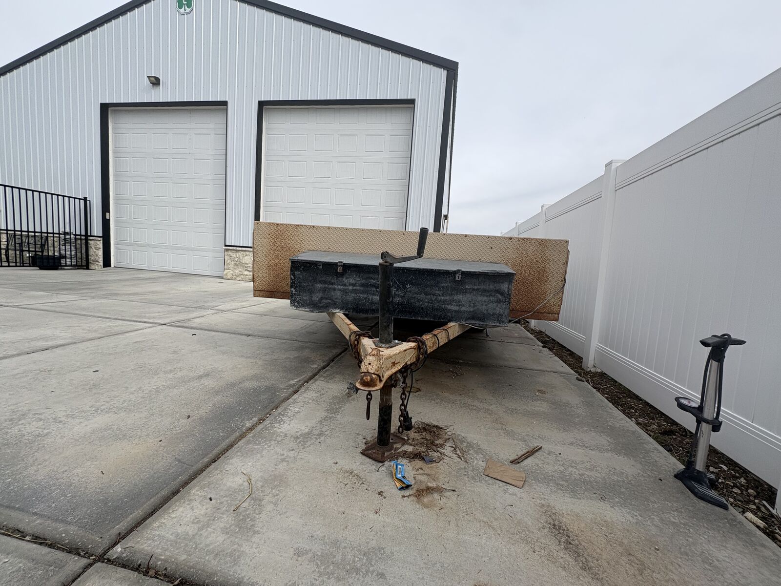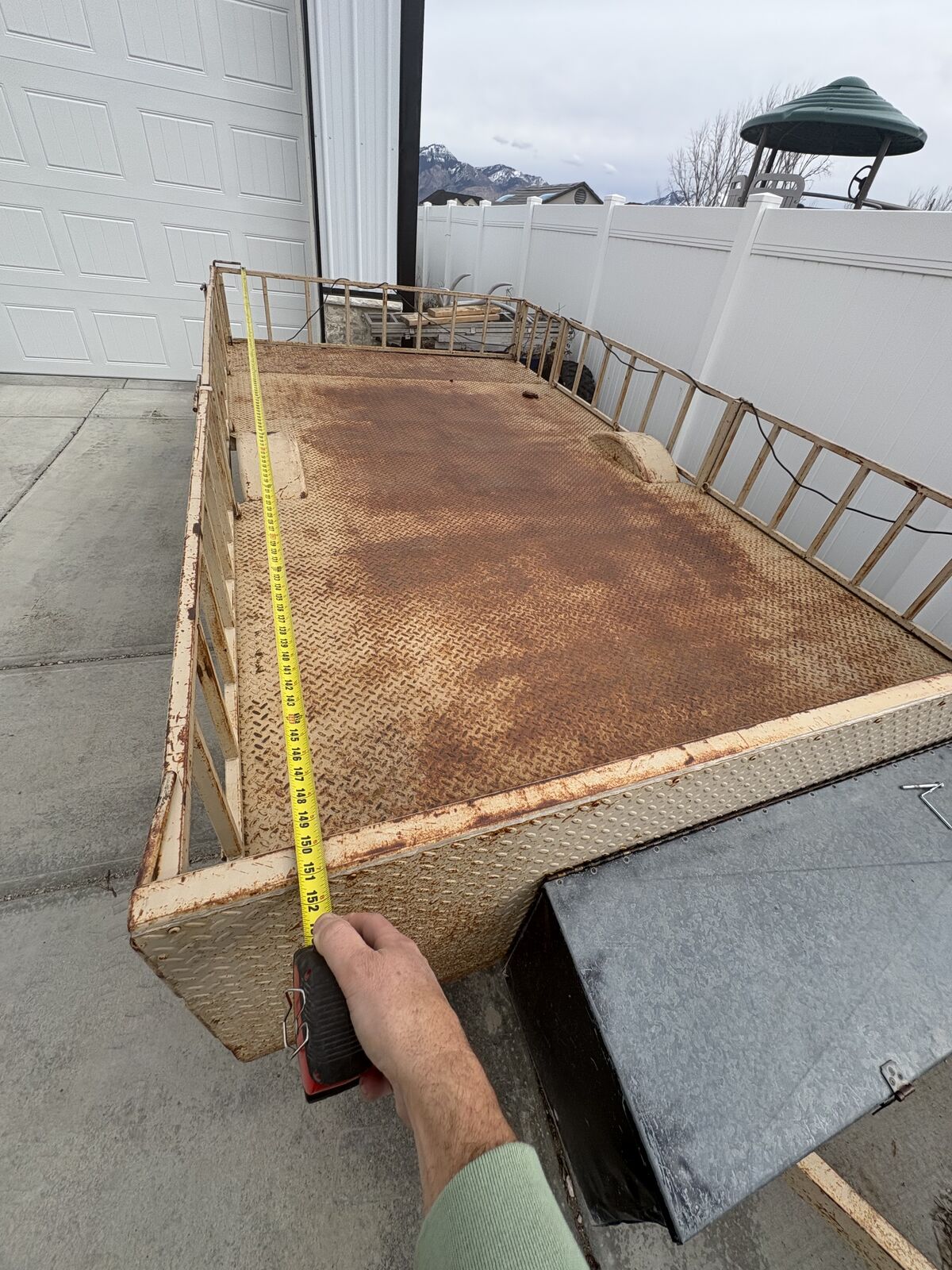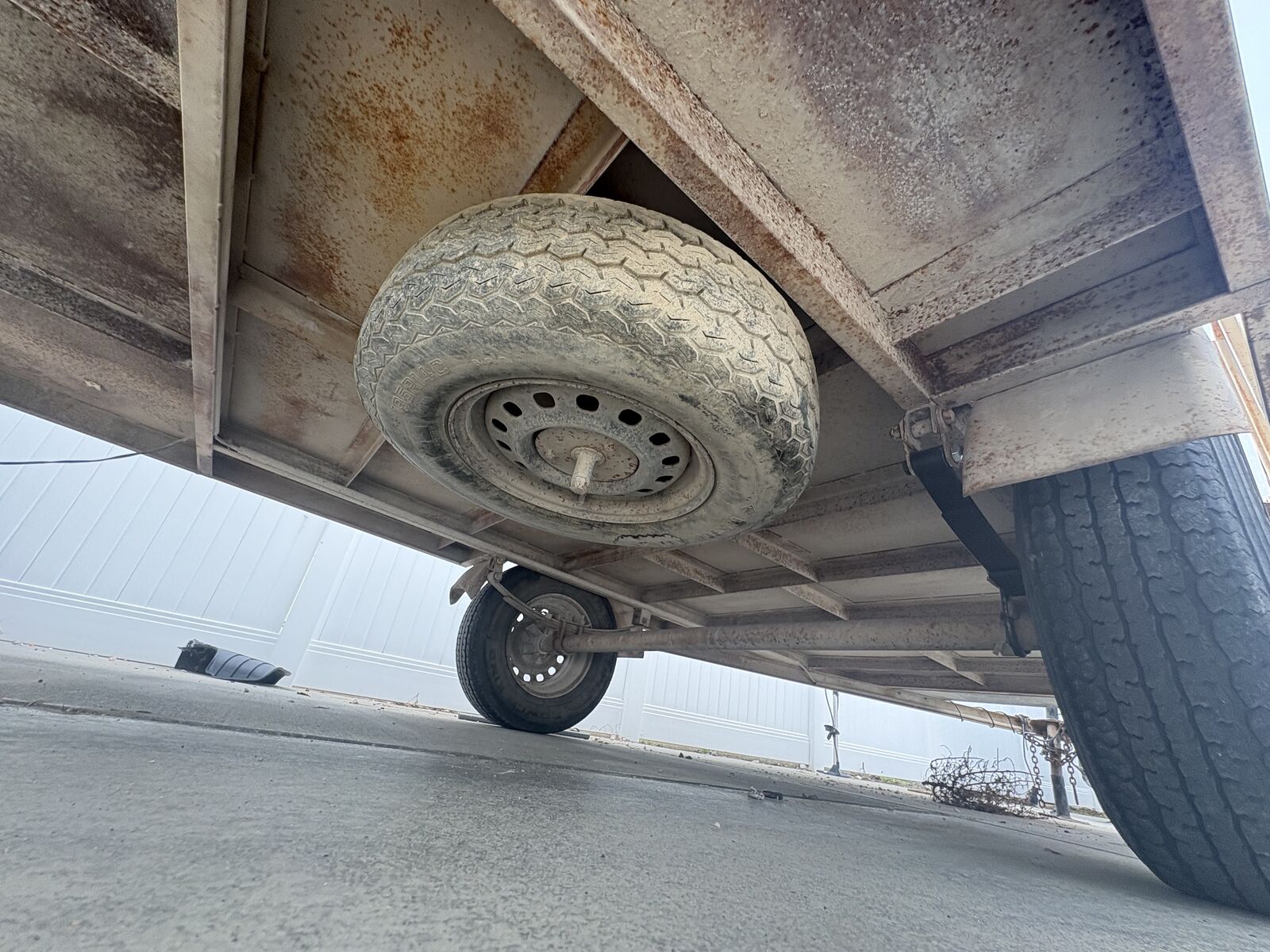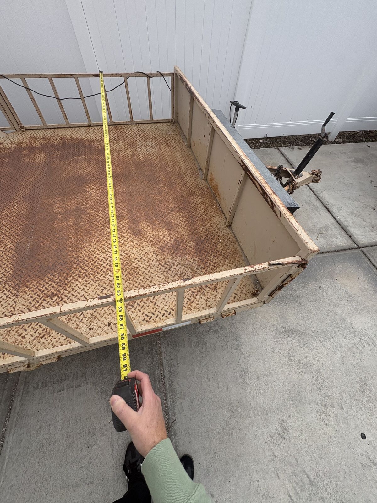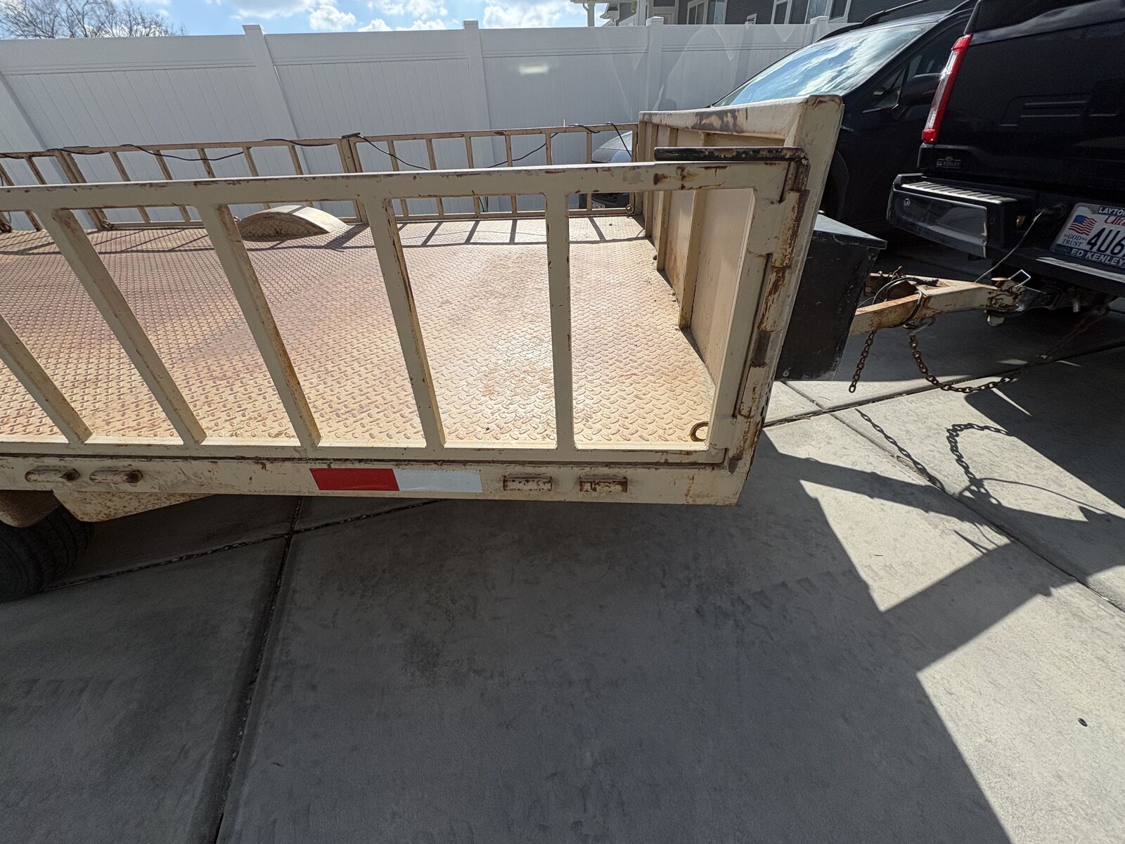 12.5 X 7 foot trailer with diamond-plate deck/all steel construction. Tires are in good shape with a spare mounted under the deck. its been a great trailer but the lights stopped working two years ago. I've been using a temp set (that's the wire you can see running on the rail). Pulls great/smooth...there's a lot of steel here. It has 10 toe-down eyes and fits 3 four wheelers, or a Sxs. I used it for three Honda four wheelers, then a Honda pioneers 1000-5...perfect size really. The side rails come off via pins and can be used as loading ramps for the back or sides, however they have gotten tight!