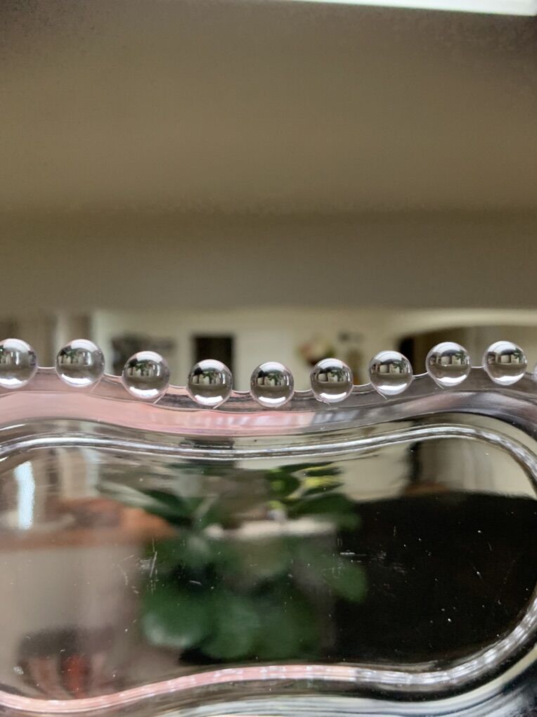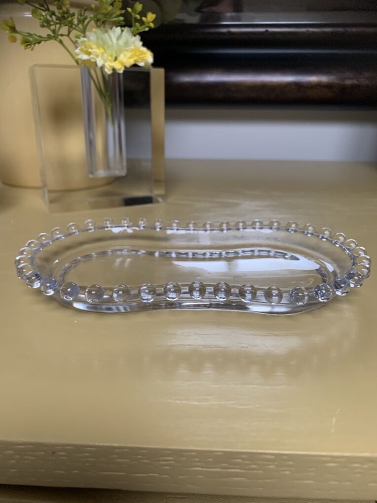 VenmoClear in color and made of glass this tray usually holds a sugar and creamer. But it can be used for other items, maybe a butter dish? 7”L x 3 3/4”W. No chips or cracks. A few marks where cream and sugar once sat. See last picture. I have the sugar bowl listed, but no cream pitcher. Clean and ready to go. Non-smoking/No pet home.
