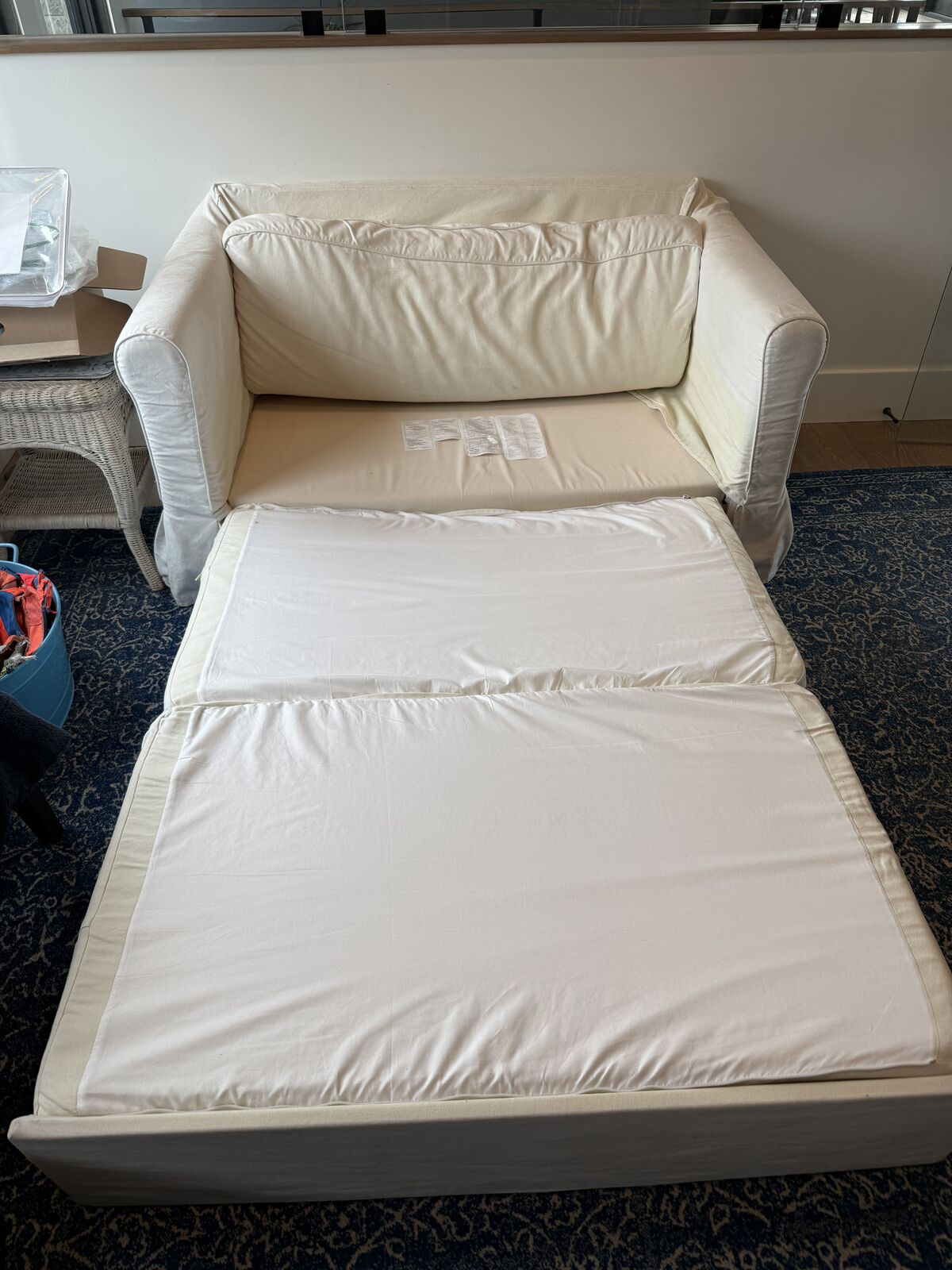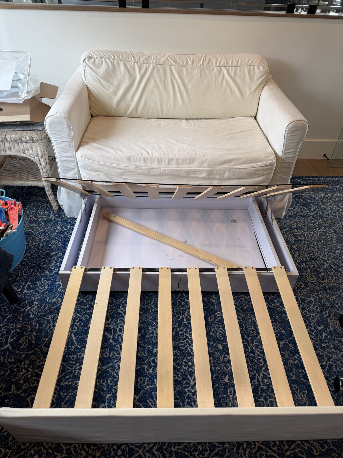 PayPalIKEA Love Seat that converts into a pullout full size bed. Couch cusion unzips to form mattress. Under seat storage for linens. All covers are removable and washable