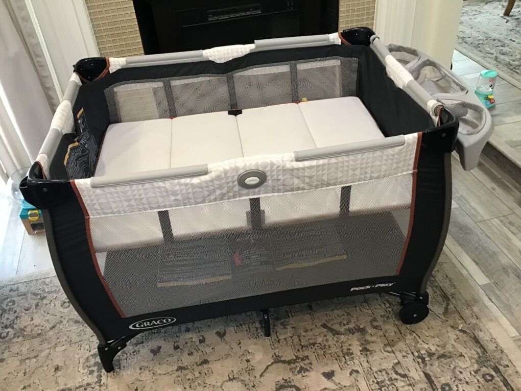Combination collapsible play pen, changing station, with carrying case.
