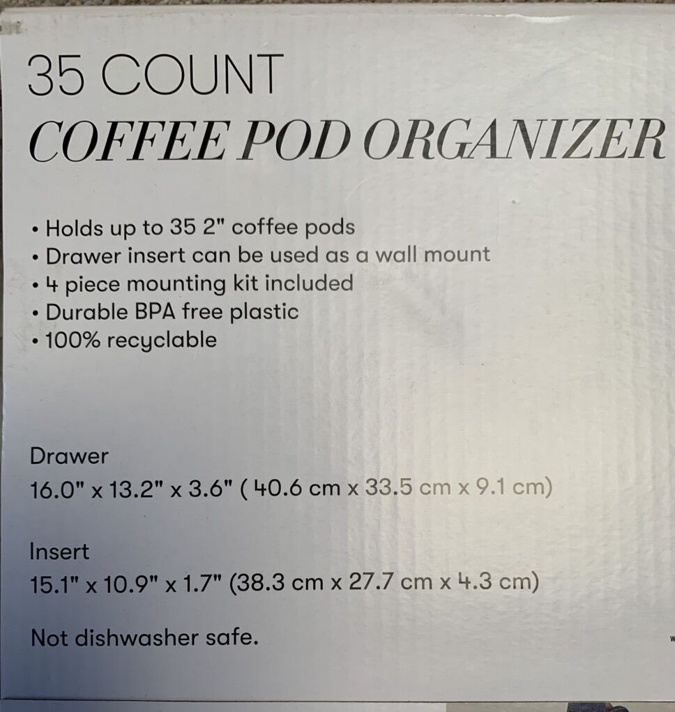 VenmoKeep all your 2” coffee pods neatly stored, at the office or at home. Never opened. Can be wall mounted. Dimension in picture on package. Clean and ready to go. Non-smoking/No pet home