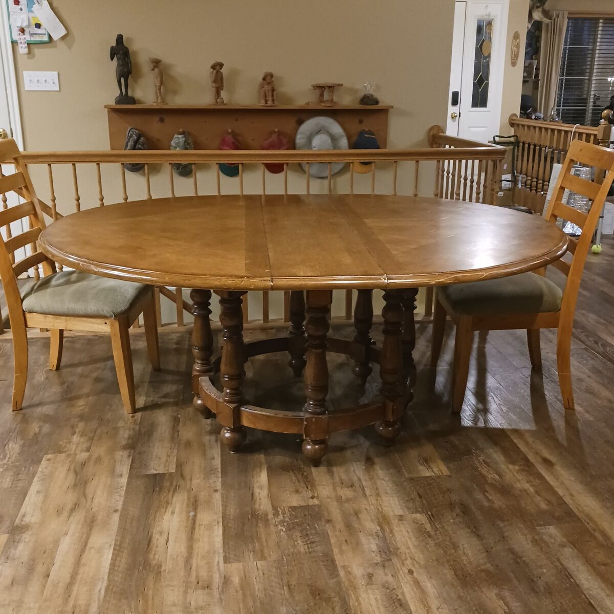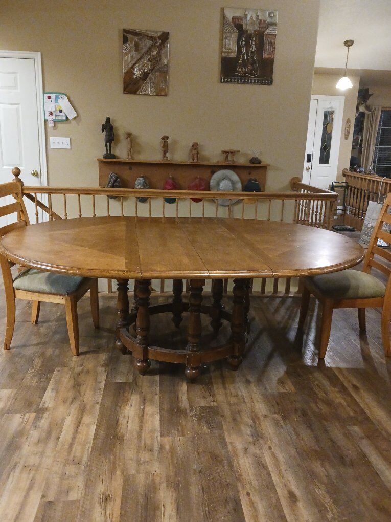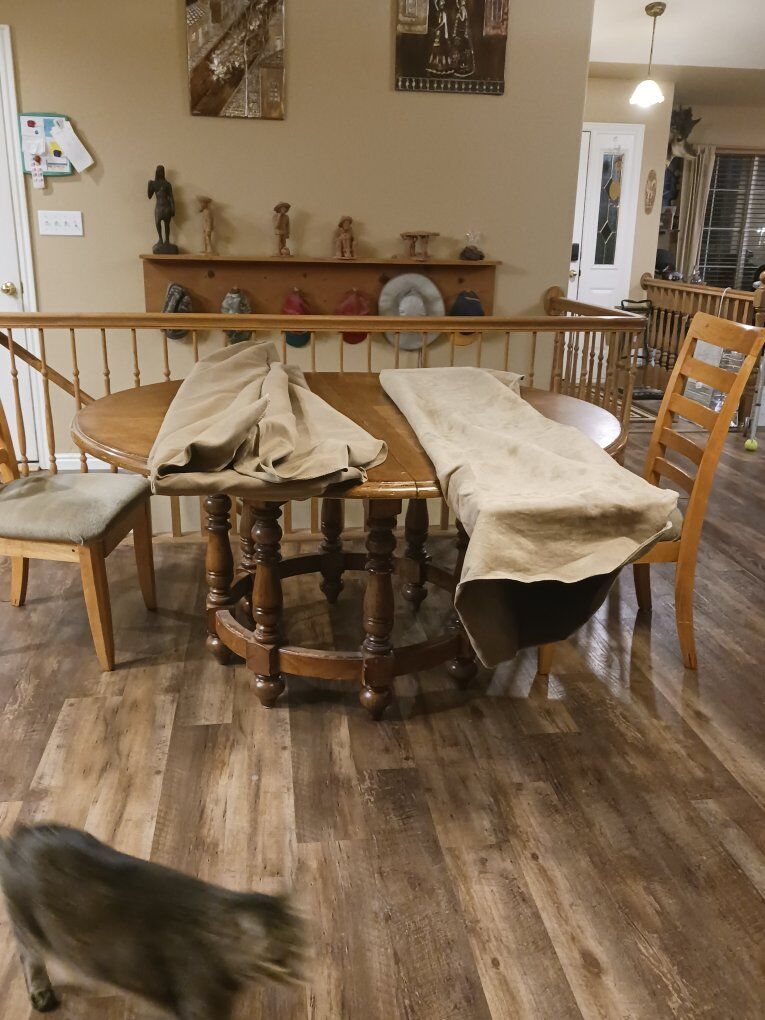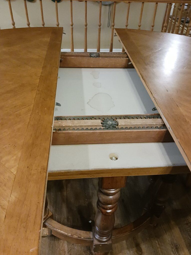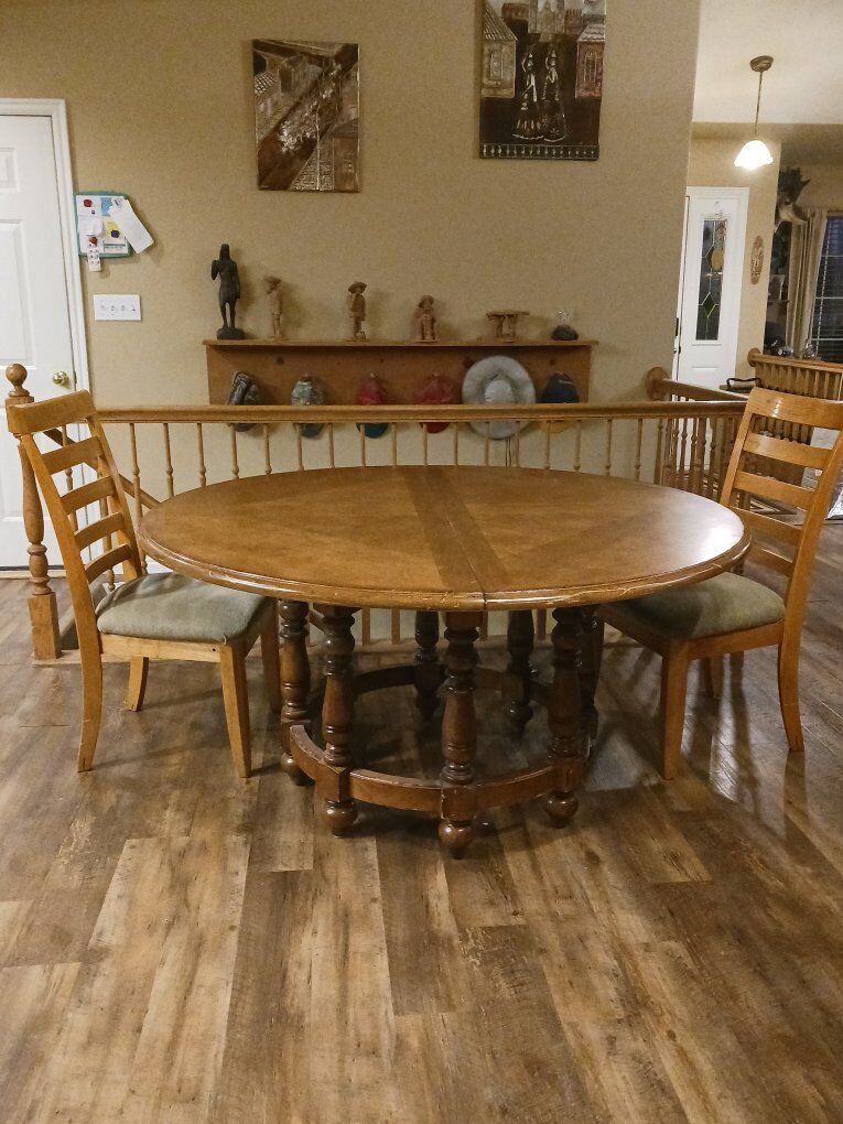 We are selling our kitchen table and chairs. We recently got a new table that was a better fit for our space. This is a nice table, has minimal wear and tear as you can see in the photos. with both leafs in it can seat 8 to 9 people. It's a solid wood table and in good condition.