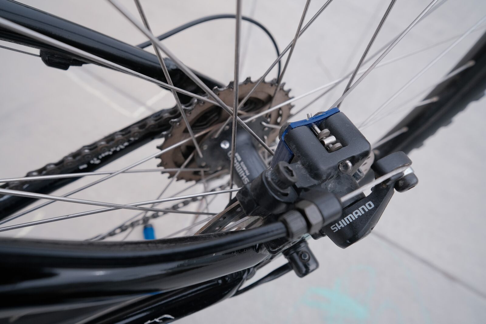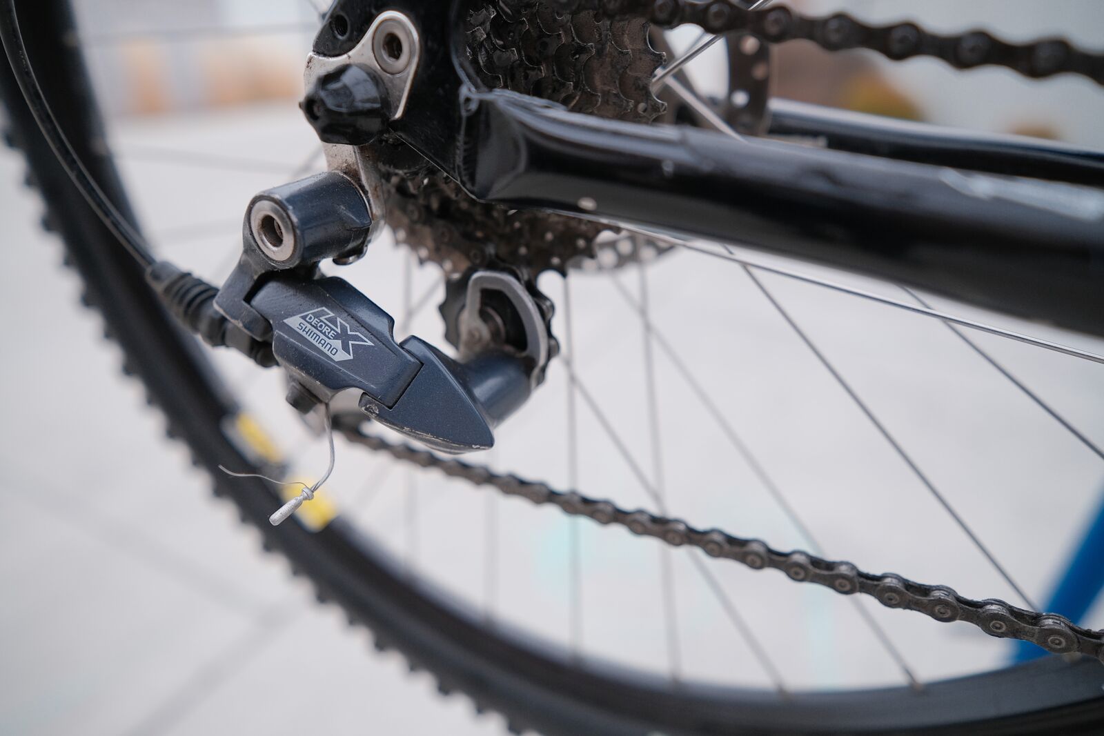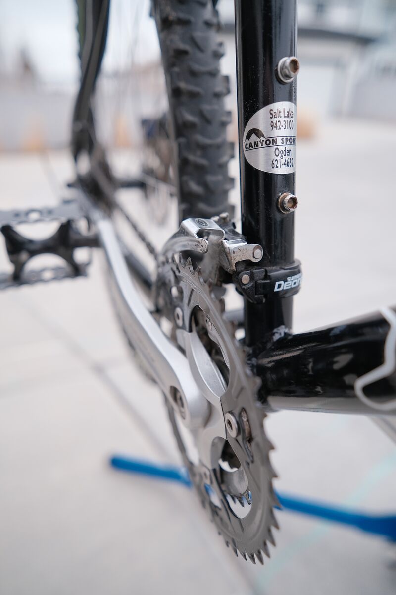 It's in pretty good shape with the kind of wear you'd expect for its age (some scuffs but no dents). At some point I swapped out the stem and bars from a Specialized Stumpjumper (lighter and the stem was a bit shorter). New grips and saddle. Fork moves pretty much as good as it did new. Has problems shifting, I suspect the cables and housing could be replaced by your local bike shop and it'd fix it. Nice Shimano LX rear derailluer though! Shimano wheels and cassette, avid levers and shimano mechanical disk brakes.