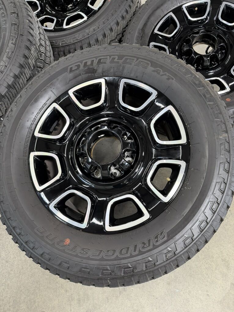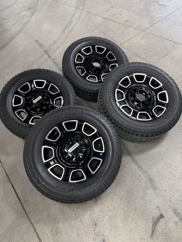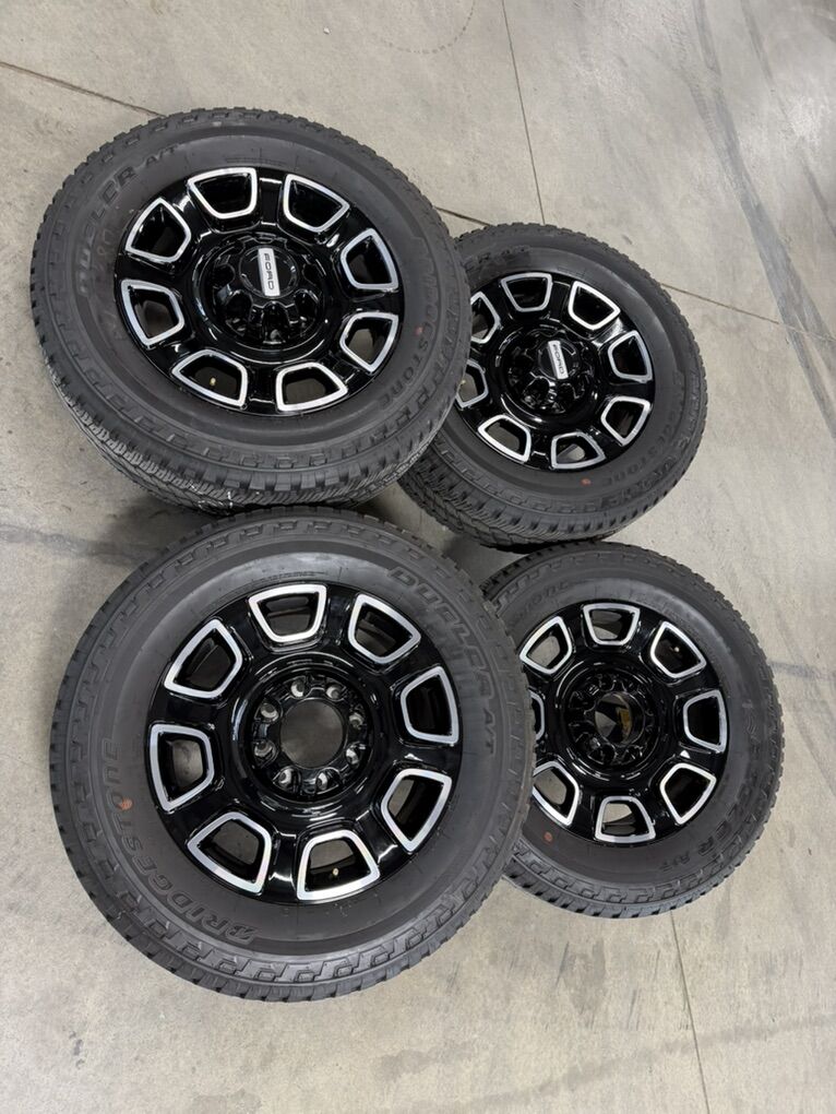 Wheels are 20in OEM wheels off a 2026 ford f350 platinum package. Wheels are in perfect shape, no curb rash, dings or major damage on them. Wheels look as if they just rolled off the assembly line. All of the center caps are also included and in great shape. Tires are 275/65/20 Bridgestone dueler all terrain, load range E, top of the line tires, very quiet and nice riding. Less than 5 miles so they are brand new.
