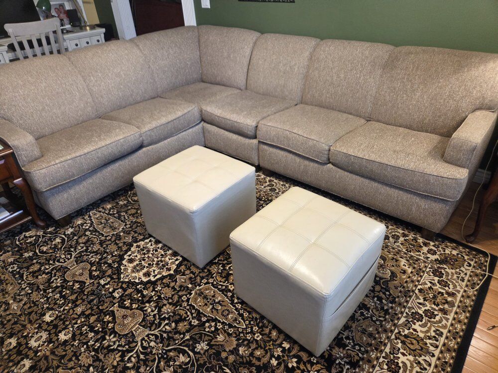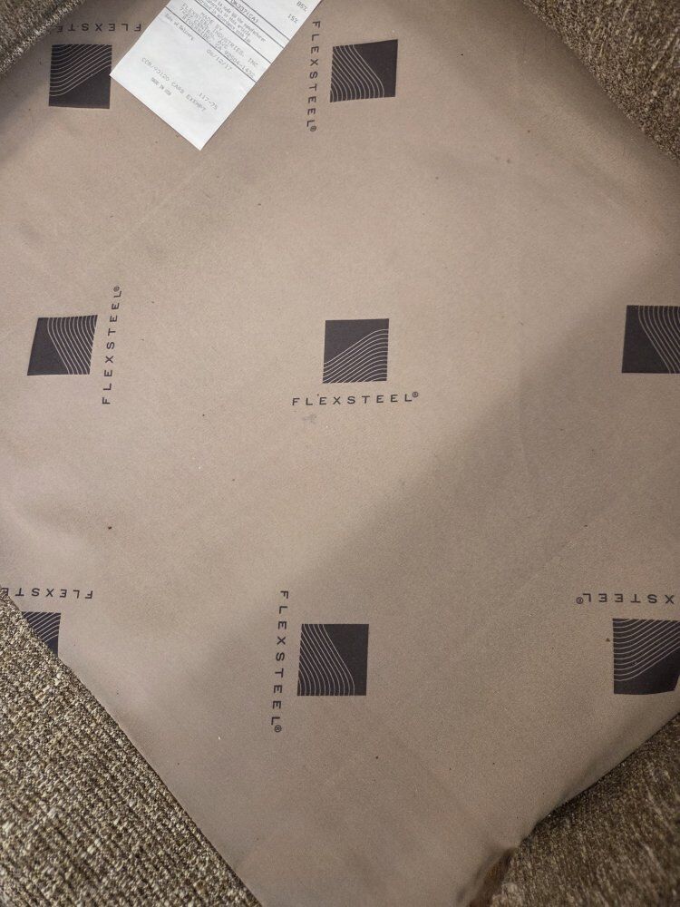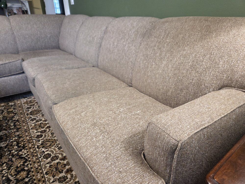 Flex Steel sectional Tan, beige, white fleck fabric upholstery over reversible foam cushion. Compact dimensions, does not take up a whole room's space. Fits nicely in most any room and does not have to set away from a wall. No recliner hardware to require operating space or contribute to shaky construction. Made in USA.